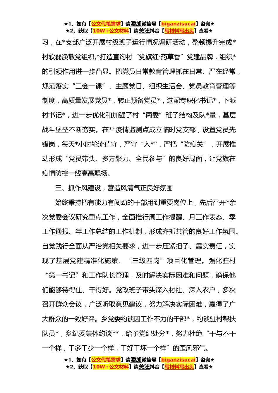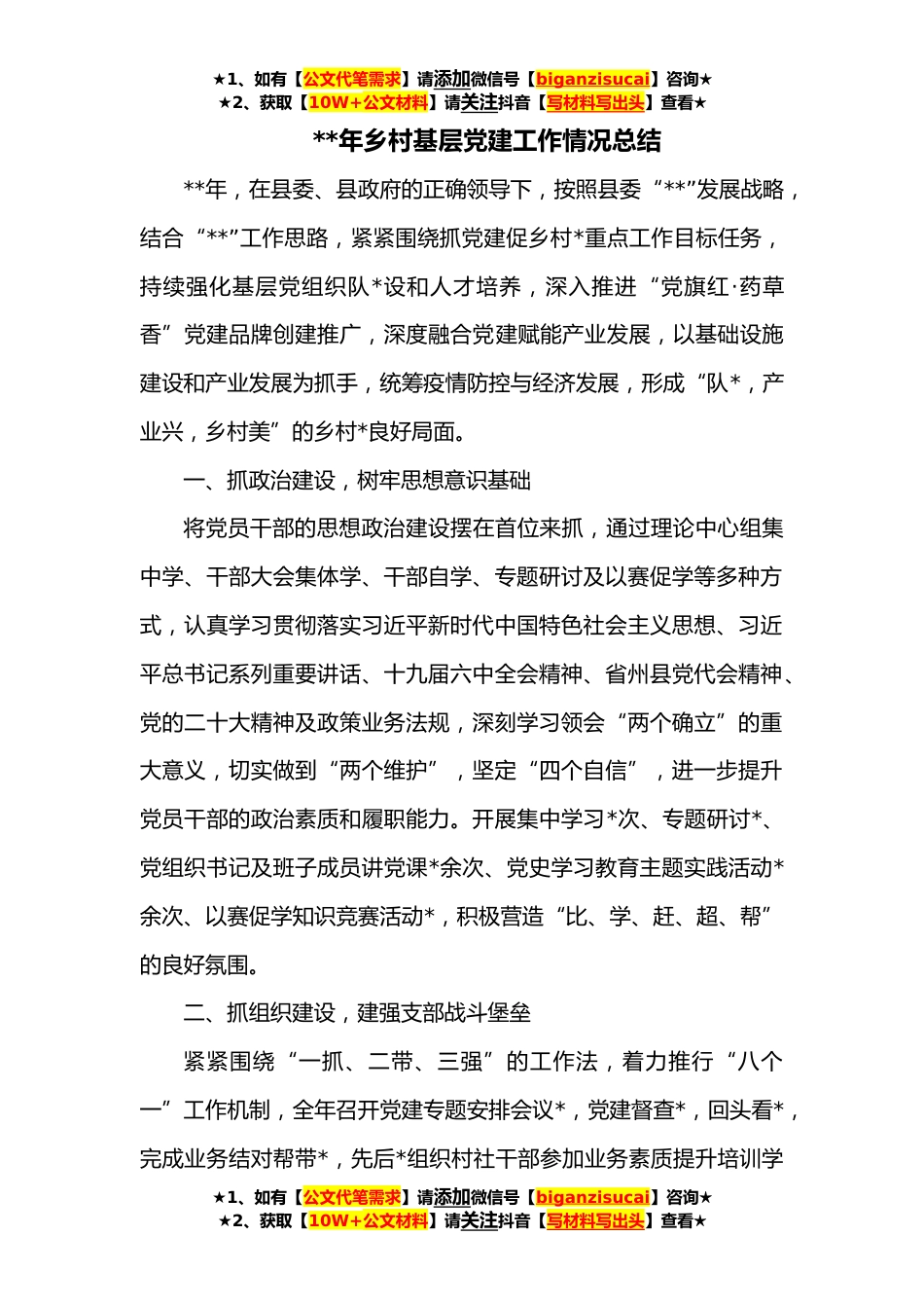 ★1、如有【公文代笔需求】请添加微信号【biganzisucai】咨询★★2、获取【10W+公文材料】请关注抖音【写材料写出头】查看★**年乡村基层党建工作情况总结**年,在县委、县政府的正确领导下,按照县委“**”发展战略,结合“**”工作思路,紧紧围绕抓党建促乡村*重点工作目标任务,持续强化基层党组织队*设和人才培养,深入推进“党旗红·药草香”党建品牌创建推广,深度融合党建赋能产业发展,以基础设施建设和产业发展为抓手,统筹疫情防控与经济发展,形成“队*,产业兴,乡村美”的乡村*良好局面。一、抓政治建设,树牢思想意识基础将党员干部的思想政治建设摆在首位来抓,通过理论中心组集中学、干部大会集体学、干部自学、专题研讨及以赛促学等多种方式,认真学习贯彻落实习近平新时代中国特色社会主义思想...