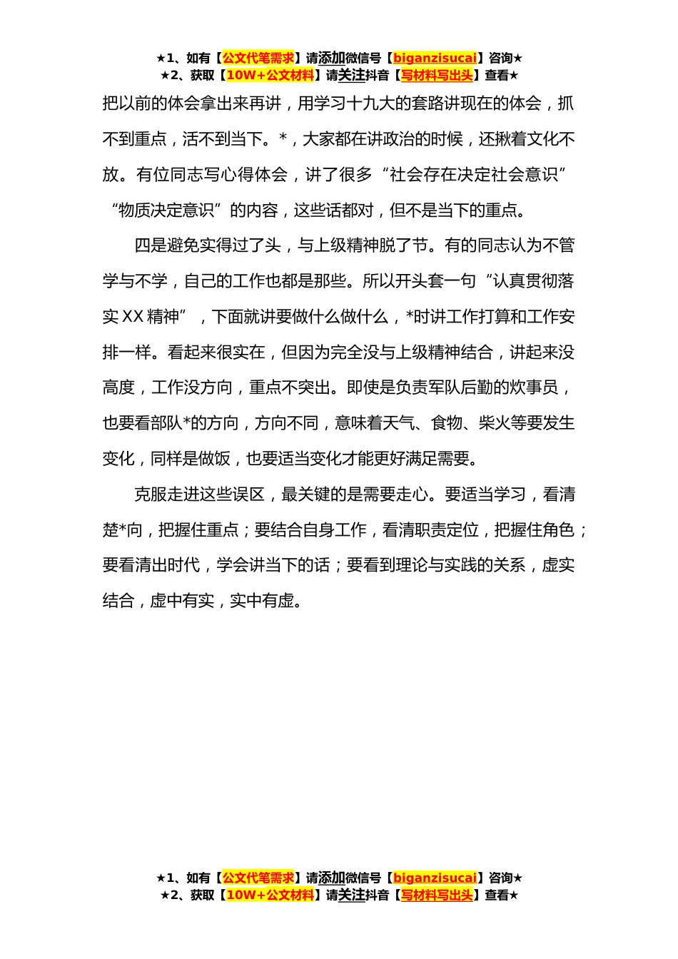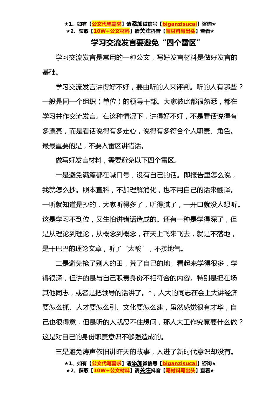 ★1、如有【公文代笔需求】请添加微信号【biganzisucai】咨询★★2、获取【10W+公文材料】请关注抖音【写材料写出头】查看★学习交流发言要避免“四个雷区”学习交流发言是常用的一种公文,写好发言材料是做好发言的基础。学习交流发言讲得好不好,要由听的人来评判。听的人有哪些?一般是同一个组织(单位)的领导干部。大家彼此都很熟悉,都在学习并作交流发言。在这种情况下,讲得好不好,不是看话说得有多漂亮,而是看话说得有多走心,说得有多符合个人职责、角色。最最重要的是,不要入雷区讲错话。做写好发言材料,需要避免以下四个雷区。一是避免满篇都在喊口号,没有自己的话。即报告里怎么说,我就怎么抄。照本宣科,不加理解消化,也不用自己的话来翻译。一听就知道是抄的,大家听得多了,听得腻了,一...