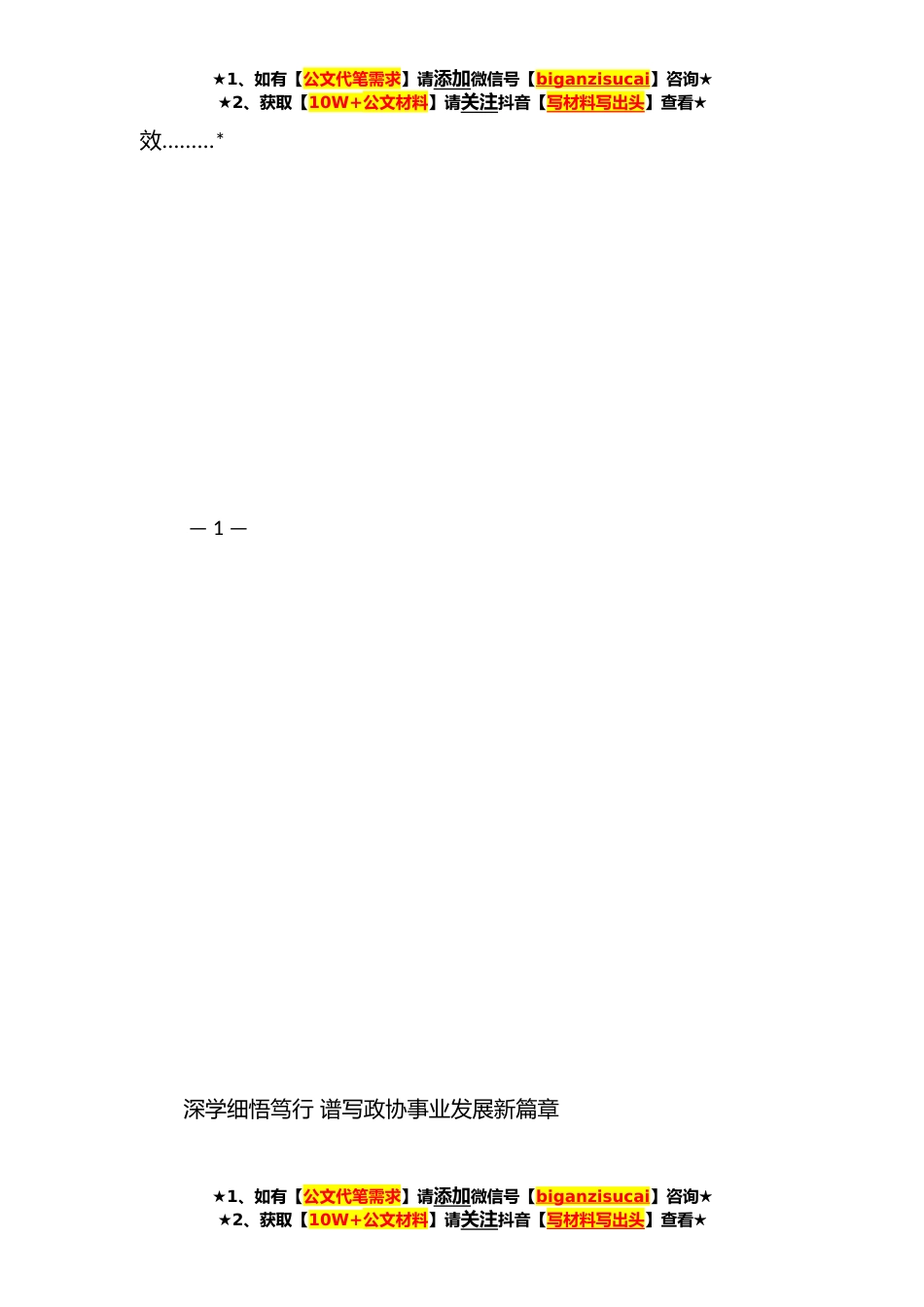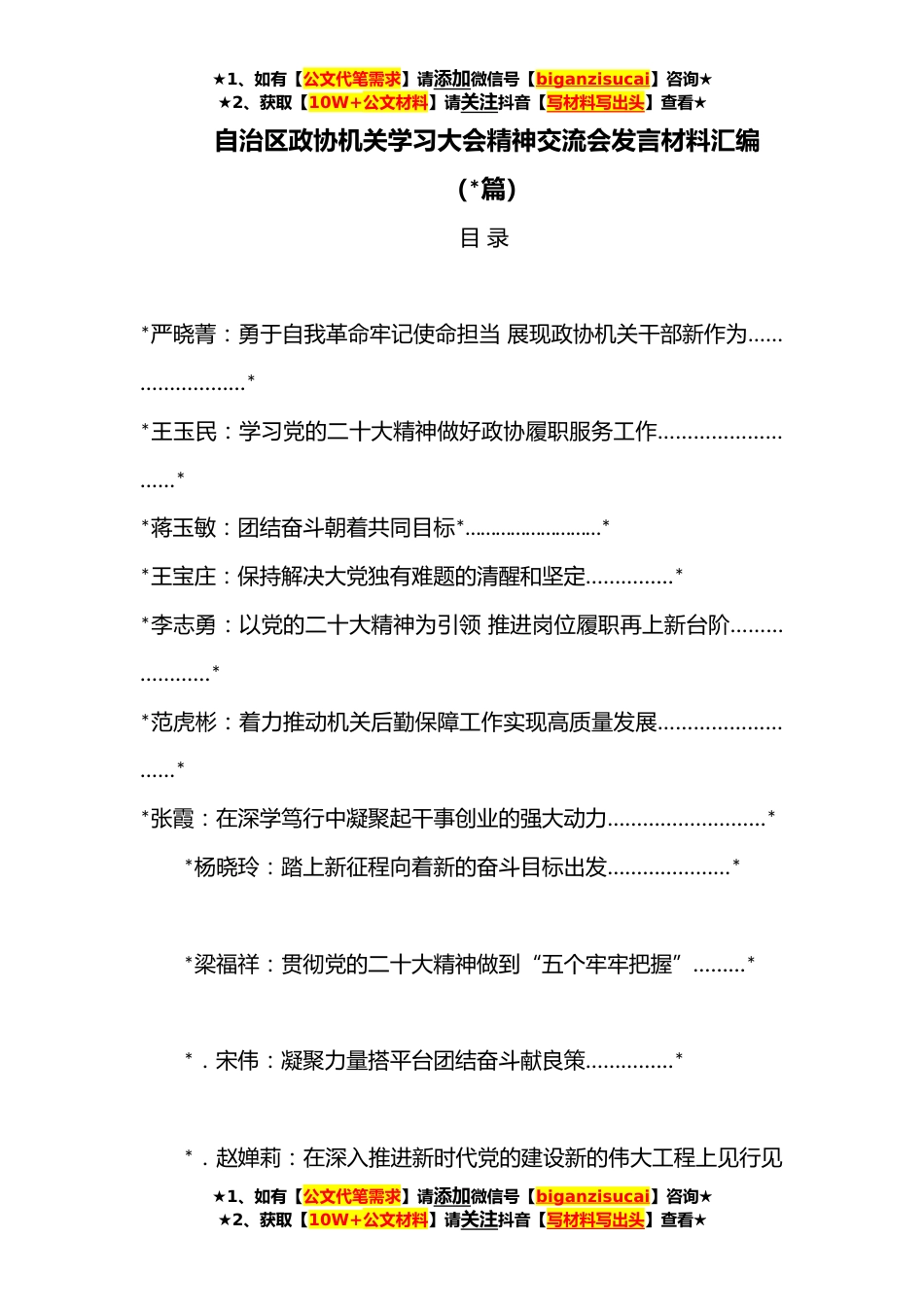 ★1、如有【公文代笔需求】请添加微信号【biganzisucai】咨询★★2、获取【10W+公文材料】请关注抖音【写材料写出头】查看★自治区政协机关学习大会精神交流会发言材料汇编(*篇)目录*严晓菁:勇于自我革命牢记使命担当展现政协机关干部新作为……………………**王玉民:学习党的二十大精神做好政协履职服务工作………………………**蒋玉敏:团结奋斗朝着共同目标*………………………**王宝庄:保持解决大党独有难题的清醒和坚定……………**李志勇:以党的二十大精神为引领推进岗位履职再上新台阶…………………**范虎彬:着力推动机关后勤保障工作实现高质量发展………………………**张霞:在深学笃行中凝聚起干事创业的强大动力………………………**杨晓玲:踏上新征程向着新的奋斗目标出发…………………**梁...