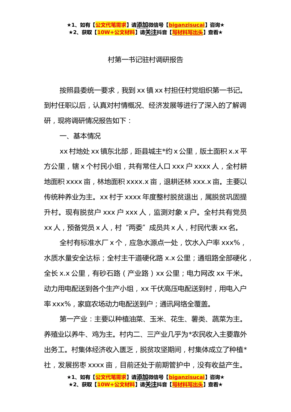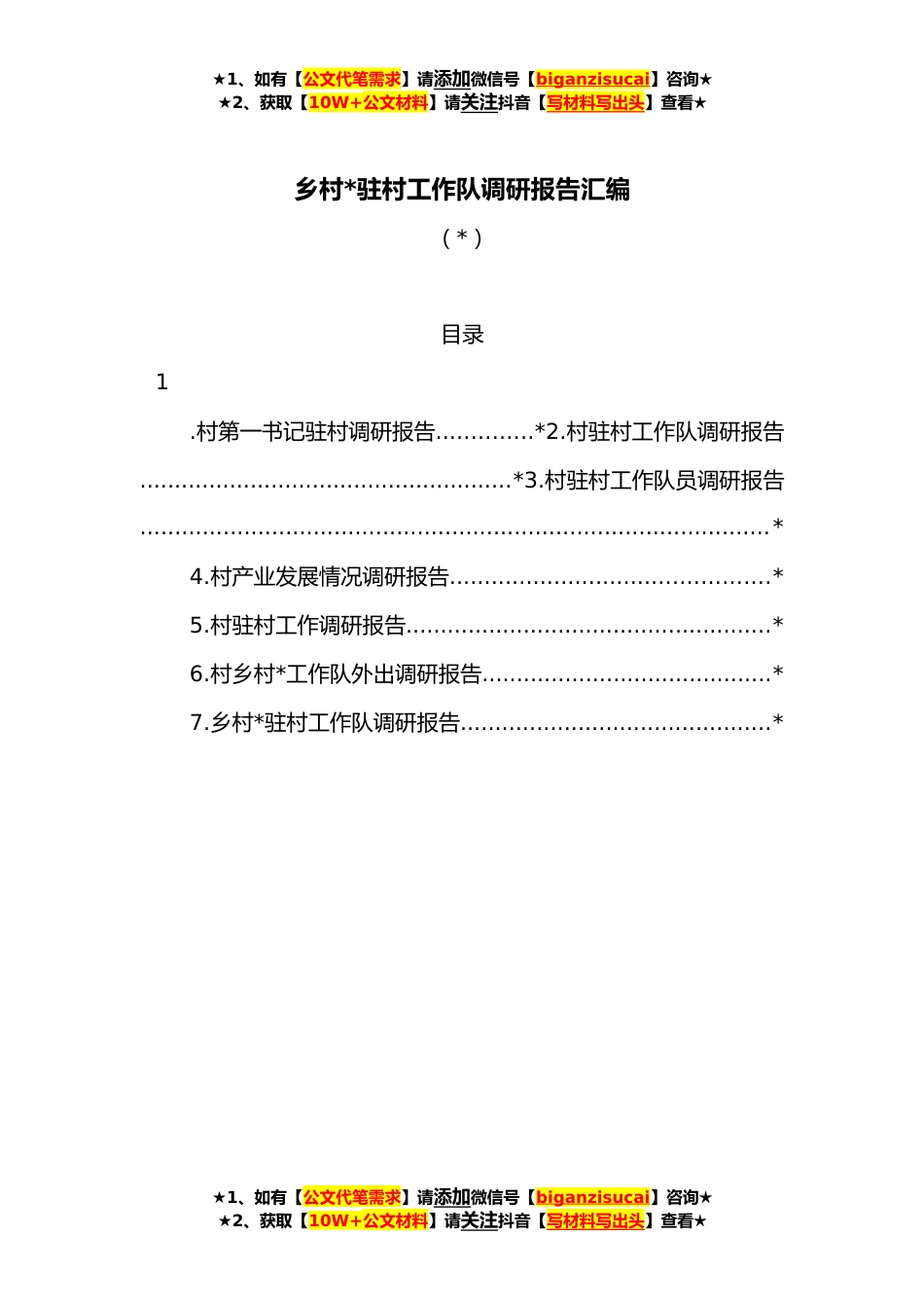★1、如有【公文代笔需求】请添加微信号【biganzisucai】咨询★★2、获取【10W+公文材料】请关注抖音【写材料写出头】查看★乡村*驻村工作队调研报告汇编(*)目录1.村第一书记驻村调研报告..............*2.村驻村工作队调研报告......................................................*3.村驻村工作队员调研报告...........................................................................................*4.村产业发展情况调研报告..............................................*5.村驻村工作调研报告.....................................................*6.村乡村*工作队外出调研报告..........................................*7.乡村*驻村工作队调研报告..........................................