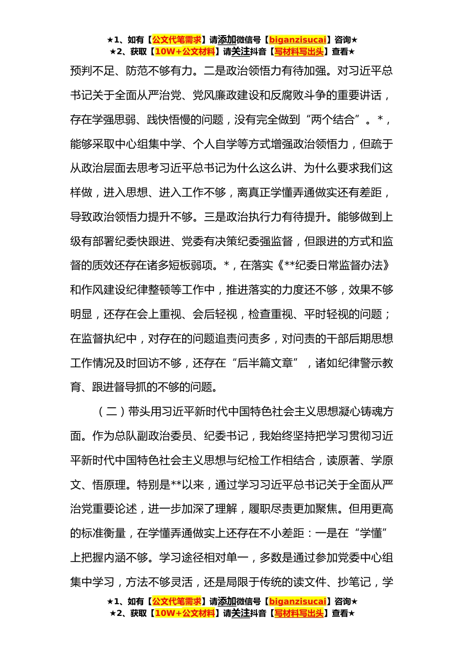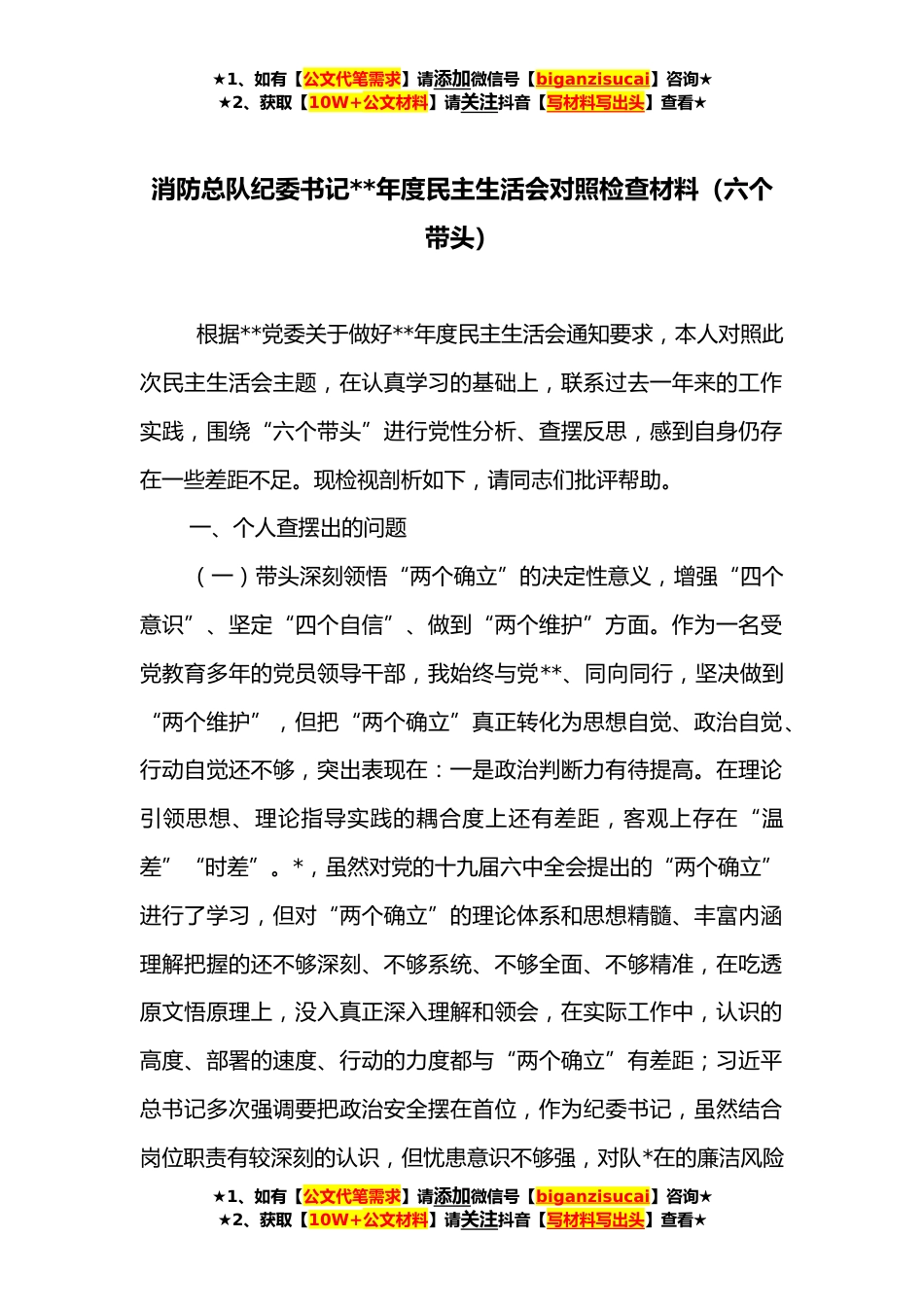 ★1、如有【公文代笔需求】请添加微信号【biganzisucai】咨询★★2、获取【10W+公文材料】请关注抖音【写材料写出头】查看★消防总队纪委书记**年度民主生活会对照检查材料(六个带头)根据**党委关于做好**年度民主生活会通知要求,本人对照此次民主生活会主题,在认真学习的基础上,联系过去一年来的工作实践,围绕“六个带头”进行党性分析、查摆反思,感到自身仍存在一些差距不足。现检视剖析如下,请同志们批评帮助。一、个人查摆出的问题(一)带头深刻领悟“两个确立”的决定性意义,增强“四个意识”、坚定“四个自信”、做到“两个维护”方面。作为一名受党教育多年的党员领导干部,我始终与党**、同向同行,坚决做到“两个维护”,但把“两个确立”真正转化为思想自觉、政治自觉、行动自觉还不够,突出...
