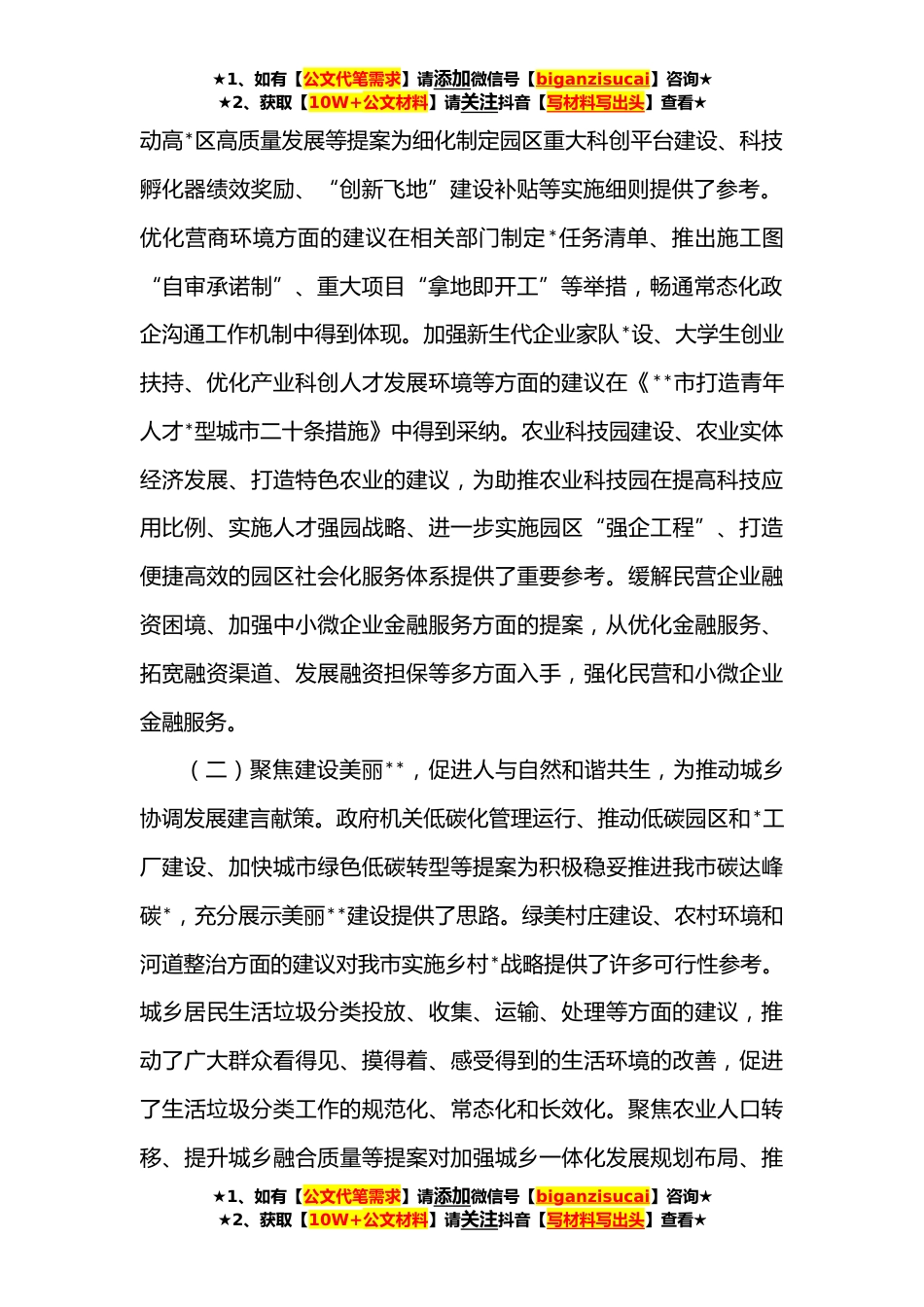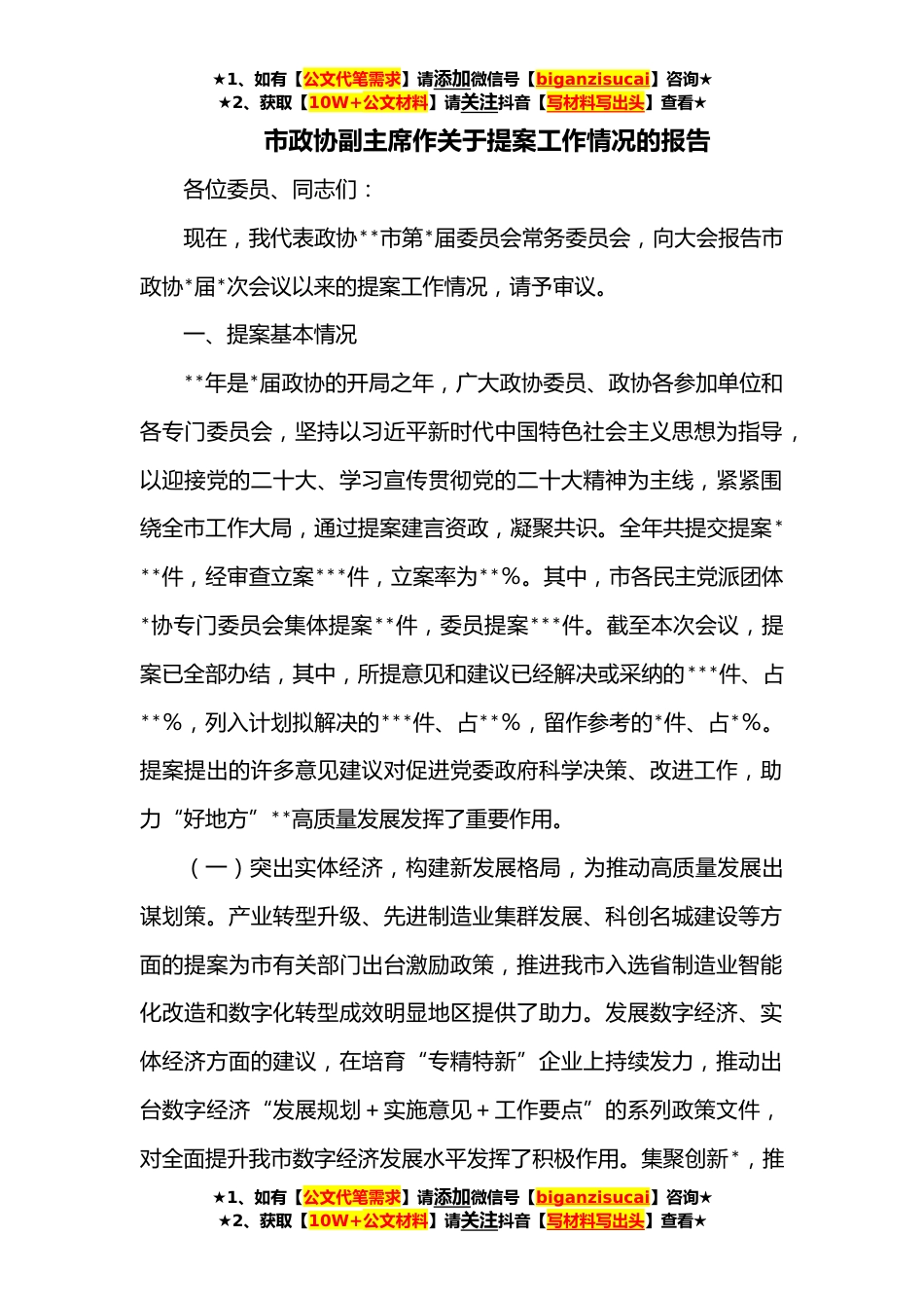 ★1、如有【公文代笔需求】请添加微信号【biganzisucai】咨询★★2、获取【10W+公文材料】请关注抖音【写材料写出头】查看★市政协副主席作关于提案工作情况的报告各位委员、同志们:现在,我代表政协**市第*届委员会常务委员会,向大会报告市政协*届*次会议以来的提案工作情况,请予审议。一、提案基本情况**年是*届政协的开局之年,广大政协委员、政协各参加单位和各专门委员会,坚持以习近平新时代中国特色社会主义思想为指导,以迎接党的二十大、学习宣传贯彻党的二十大精神为主线,紧紧围绕全市工作大局,通过提案建言资政,凝聚共识。全年共提交提案***件,经审查立案***件,立案率为**%。其中,市各民主党派团体*协专门委员会集体提案**件,委员提案***件。截至本次会议,提案已全部办结,其中,所提意见...