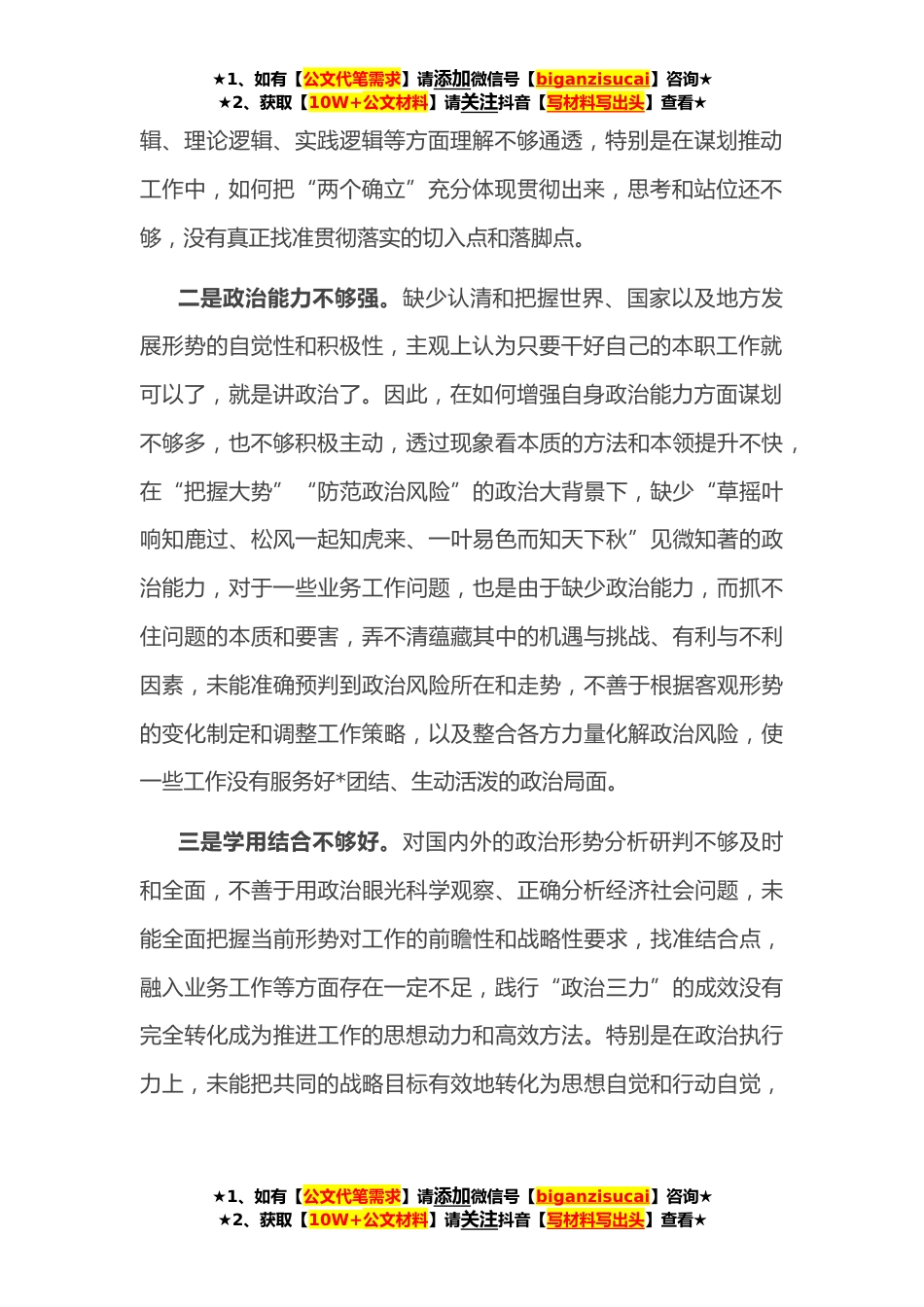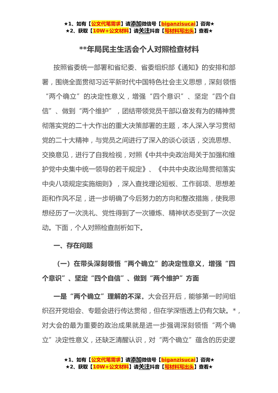 ★1、如有【公文代笔需求】请添加微信号【biganzisucai】咨询★★2、获取【10W+公文材料】请关注抖音【写材料写出头】查看★**年局民主生活会个人对照检查材料按照省委统一部署和省纪委、省委组织部《通知》的安排和部署,围绕全面贯彻习近平新时代中国特色社会主义思想,深刻领悟“两个确立”的决定性意义,增强“四个意识”、坚定“四个自信”、做到“两个维护”,团结带领党员干部以奋发有为的精神贯彻落实党的二十大作出的重大决策部署的主题,本人深入学习贯彻党的二十大精神,与党员之间进行了深入的谈心谈话,交流思想、交换意见,进行了自我检视,对照《中共中央政治局关于加强和维护党中央集中统一领导的若干规定》、《中共中央政治局贯彻落实中央八项规定实施细则》,深入查找理论短板、工作弱项、思想...