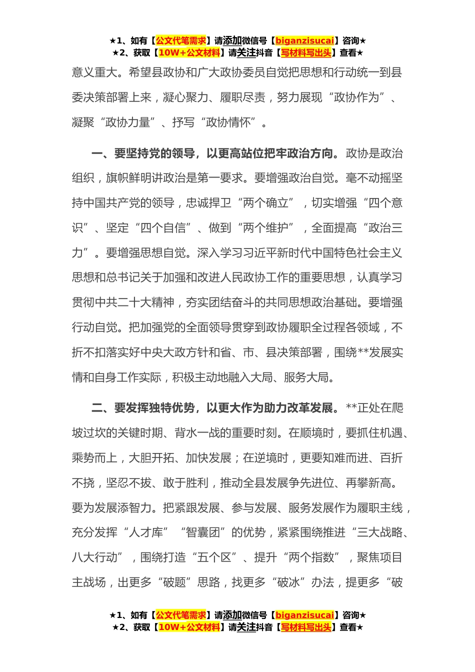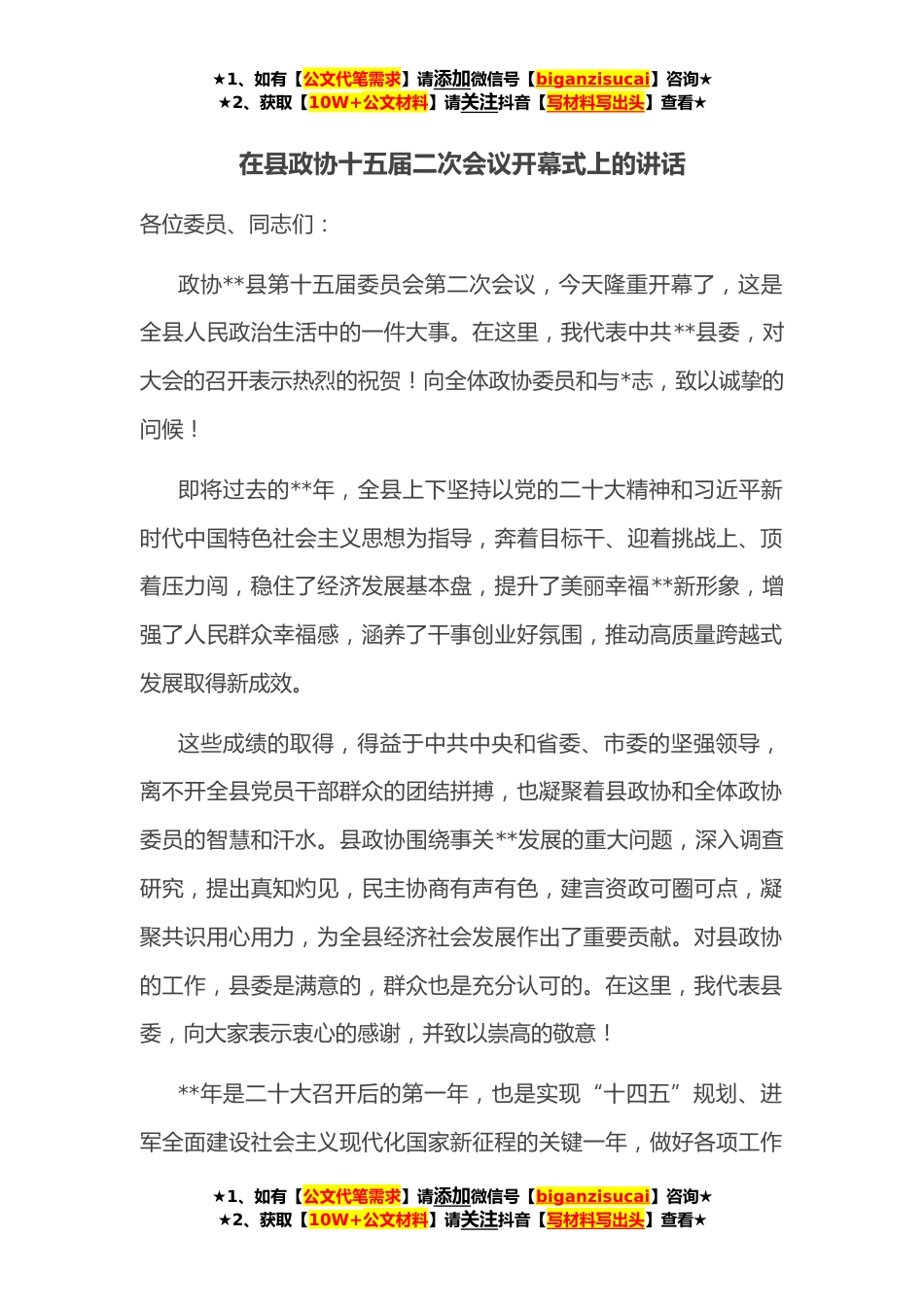 ★1、如有【公文代笔需求】请添加微信号【biganzisucai】咨询★★2、获取【10W+公文材料】请关注抖音【写材料写出头】查看★在县政协十五届二次会议开幕式上的讲话各位委员、同志们:政协**县第十五届委员会第二次会议,今天隆重开幕了,这是全县人民政治生活中的一件大事。在这里,我代表中共**县委,对大会的召开表示热烈的祝贺!向全体政协委员和与*志,致以诚挚的问候!即将过去的**年,全县上下坚持以党的二十大精神和习近平新时代中国特色社会主义思想为指导,奔着目标干、迎着挑战上、顶着压力闯,稳住了经济发展基本盘,提升了美丽幸福**新形象,增强了人民群众幸福感,涵养了干事创业好氛围,推动高质量跨越式发展取得新成效。这些成绩的取得,得益于中共中央和省委、市委的坚强领导,离不开全县党员干部...