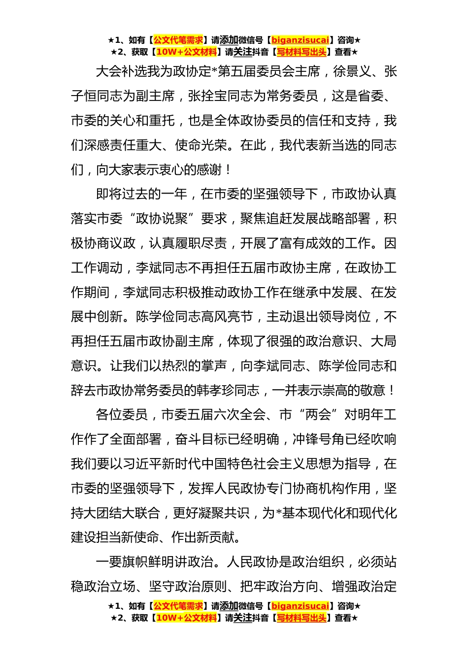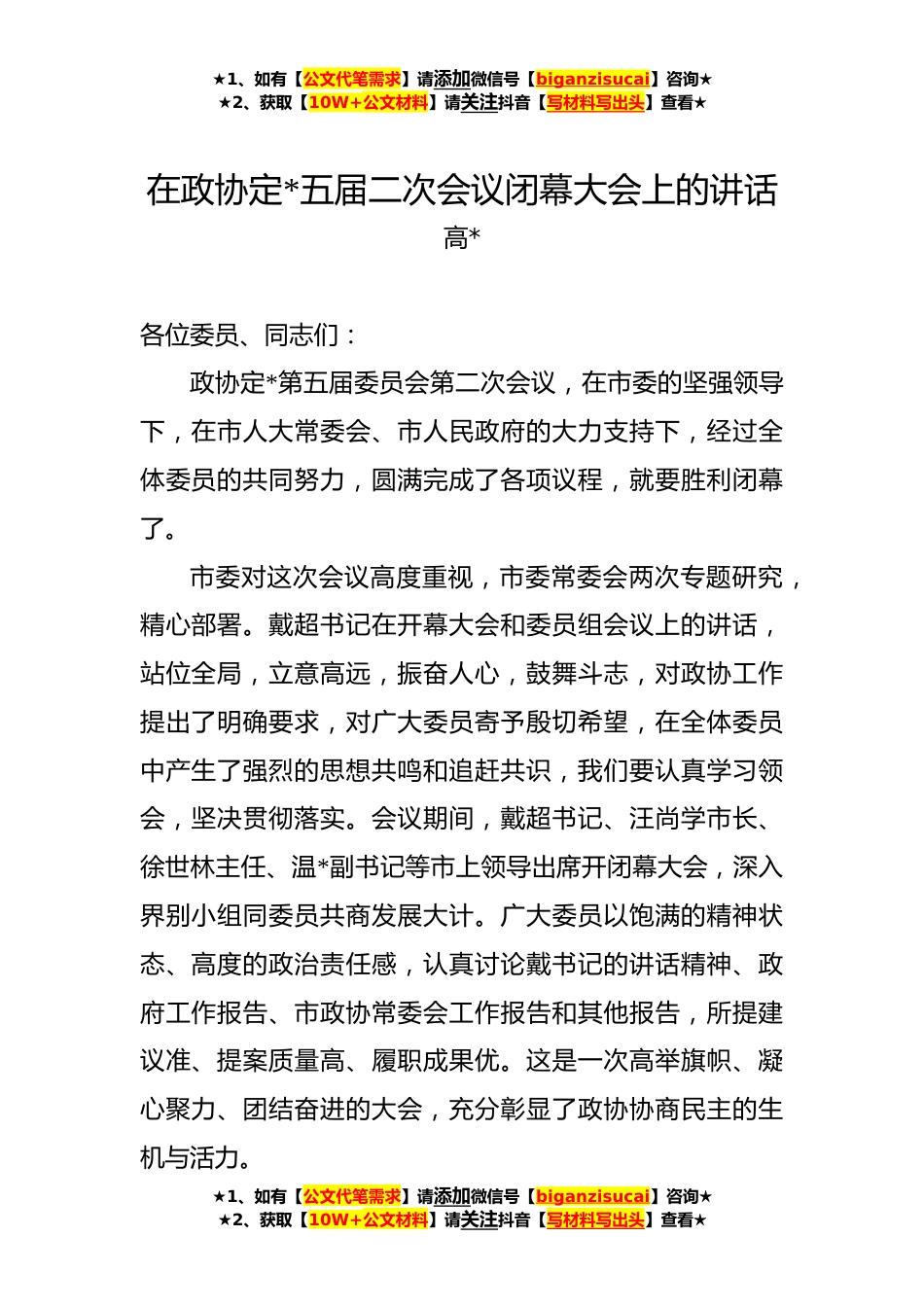 ★1、如有【公文代笔需求】请添加微信号【biganzisucai】咨询★★2、获取【10W+公文材料】请关注抖音【写材料写出头】查看★在政协定*五届二次会议闭幕大会上的讲话高*各位委员、同志们:政协定*第五届委员会第二次会议,在市委的坚强领导下,在市人大常委会、市人民政府的大力支持下,经过全体委员的共同努力,圆满完成了各项议程,就要胜利闭幕了。市委对这次会议高度重视,市委常委会两次专题研究,精心部署。戴超书记在开幕大会和委员组会议上的讲话,站位全局,立意高远,振奋人心,鼓舞斗志,对政协工作提出了明确要求,对广大委员寄予殷切希望,在全体委员中产生了强烈的思想共鸣和追赶共识,我们要认真学习领会,坚决贯彻落实。会议期间,戴超书记、汪尚学市长、徐世林主任、温*副书记等市上领导出席开闭...