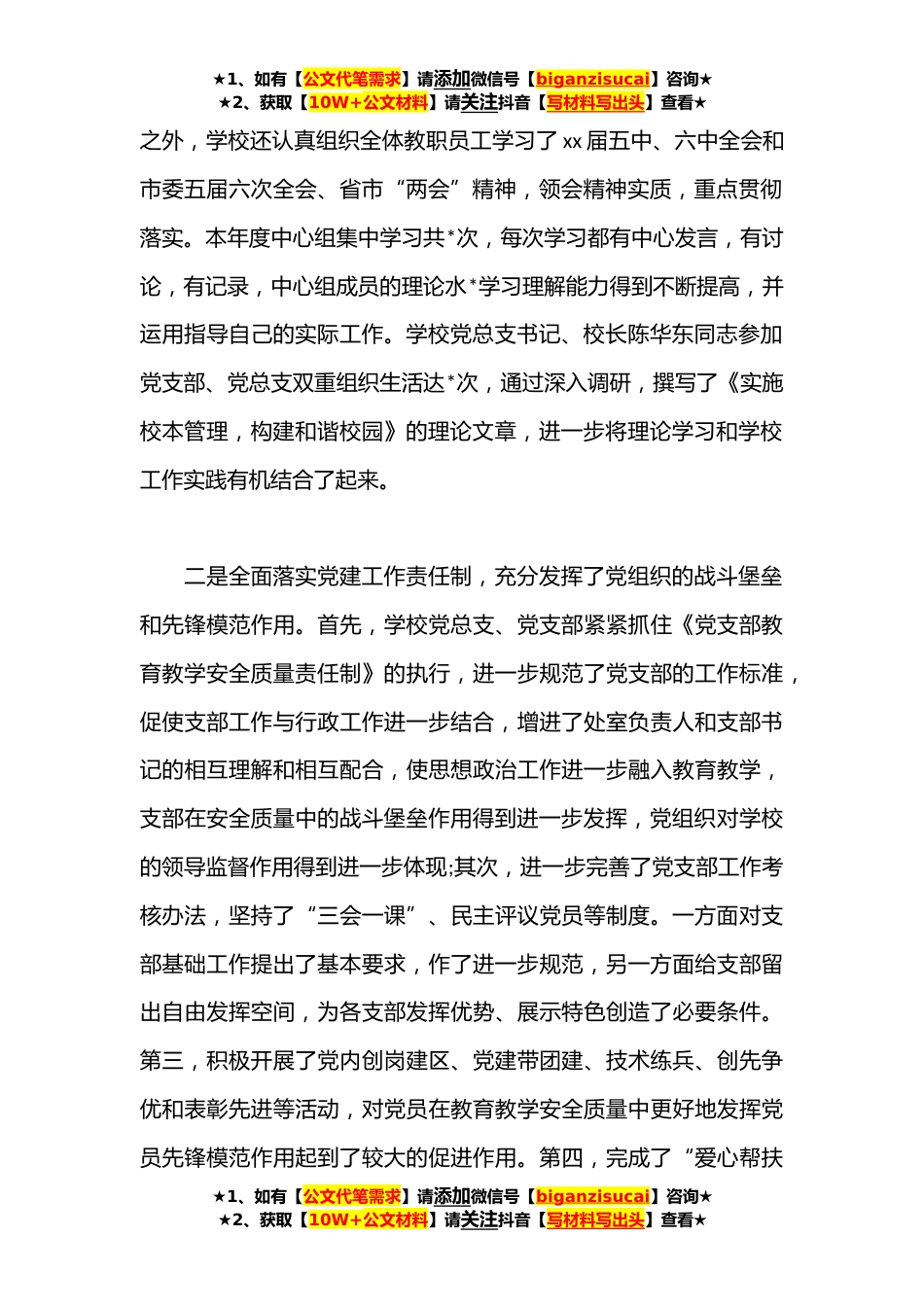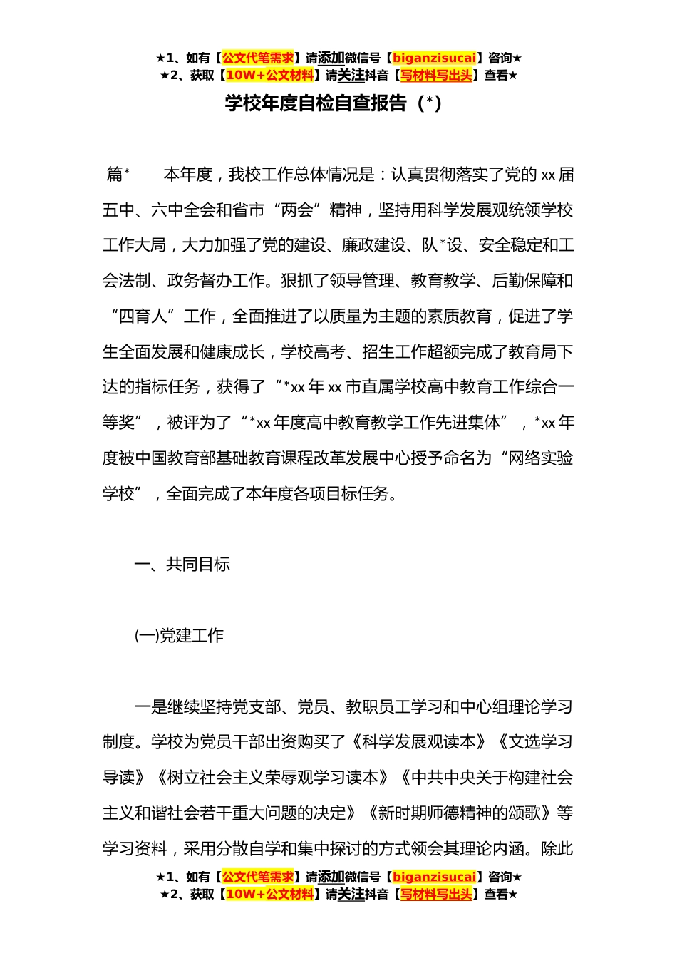 ★1、如有【公文代笔需求】请添加微信号【biganzisucai】咨询★★2、获取【10W+公文材料】请关注抖音【写材料写出头】查看★学校年度自检自查报告(*)篇*本年度,我校工作总体情况是:认真贯彻落实了党的xx届五中、六中全会和省市“两会”精神,坚持用科学发展观统领学校工作大局,大力加强了党的建设、廉政建设、队*设、安全稳定和工会法制、政务督办工作。狠抓了领导管理、教育教学、后勤保障和“四育人”工作,全面推进了以质量为主题的素质教育,促进了学生全面发展和健康成长,学校高考、招生工作超额完成了教育局下达的指标任务,获得了“*xx年xx市直属学校高中教育工作综合一等奖”,被评为了“*xx年度高中教育教学工作先进集体”,*xx年度被中国教育部基础教育课程改革发展中心授予命名为“网络实验学校...