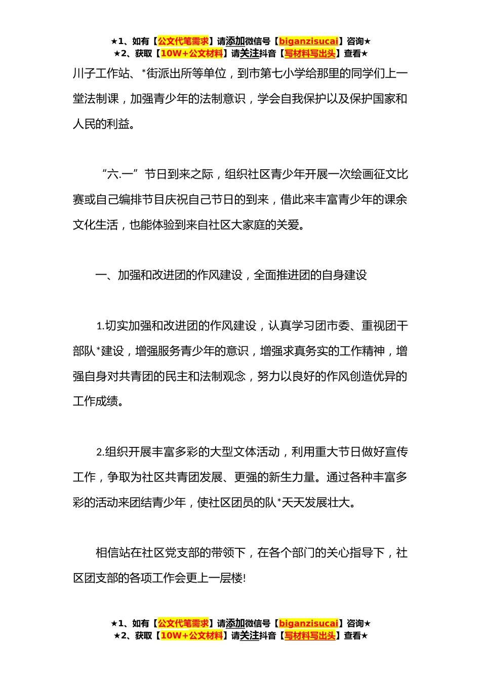 ★1、如有【公文代笔需求】请添加微信号【biganzisucai】咨询★★2、获取【10W+公文材料】请关注抖音【写材料写出头】查看★社区**年共青团工作计划(精选*篇)社区**年共青团工作计划篇*一、发挥共青团的优势,带领广大青年共同为创建和谐社区而努力1.社区团支部将在*xx年组织开展更加丰富多彩的团支部活动。*时充满契机的一年,改革开放*周年的伟大成果鼓舞着全中国人民的心,作为青年一代的我们更应该在这大好的时代里,积极提高自身素质,努力为报效国家做好准备。社区团支部预备在*组织团员开展各种形式的活动,*开展深入学习科学发展观,认真体会党的xx大报告,调动大家学习的积极性,发挥团员骨干的能力,鼓励广大团员参加到社区和社会的活动。2.充分发挥青少年在科技创新中的主力军作用,营造良好的创新环...