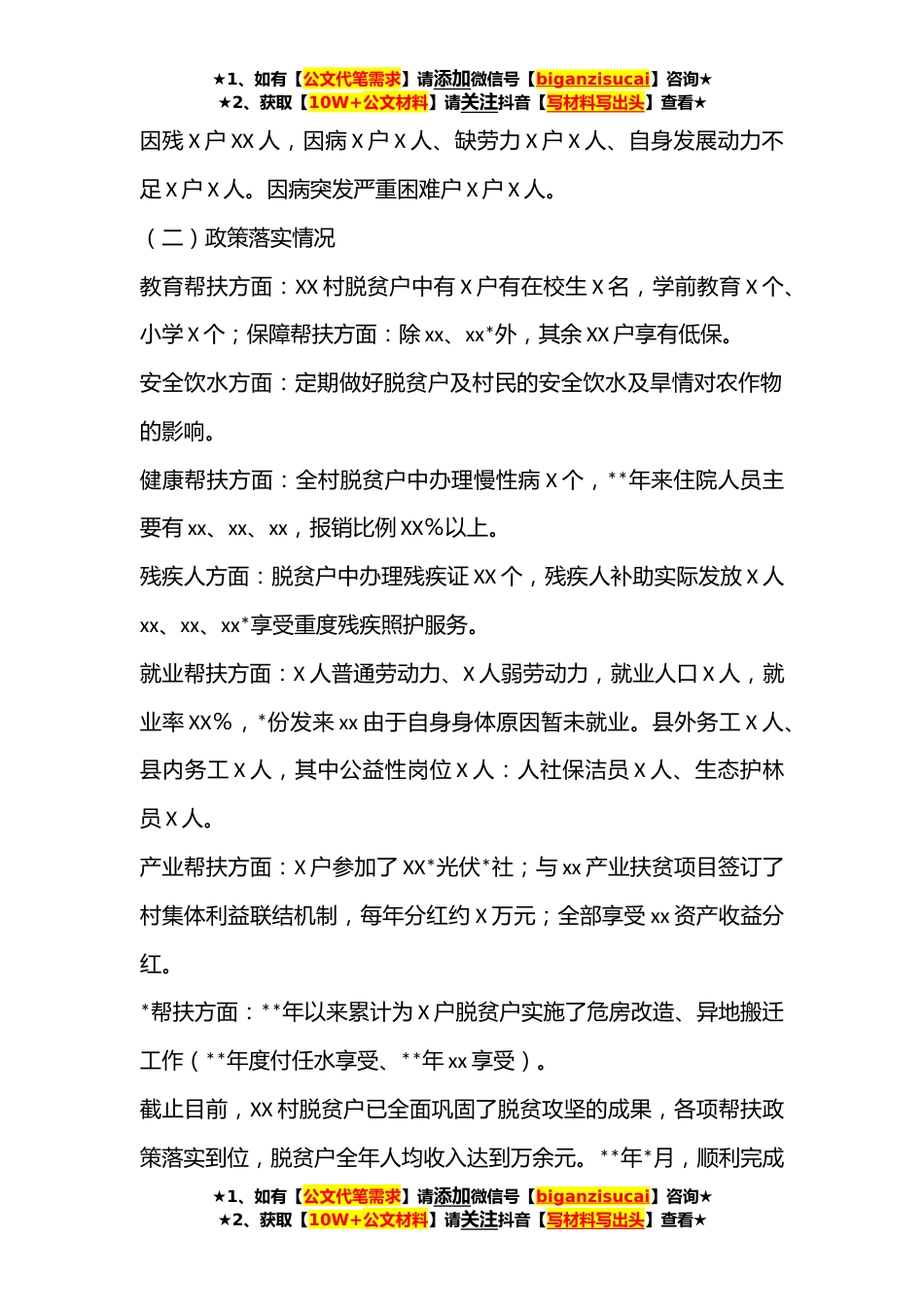 ★1、如有【公文代笔需求】请添加微信号【biganzisucai】咨询★★2、获取【10W+公文材料】请关注抖音【写材料写出头】查看★驻村工作队**年度乡村*工作总结(**)**年以来县*局、县委办驻村工作队在XX县委、县政府和XX镇党委、政府的坚强领导和XX村“两委”成员的密切配合和共同努力下,认真贯彻落实中央和省委、省政府关于乡村*工作的重大部署安排,立足XX村实际,把解决该村群众困难问题、维护稳定作为帮扶工作的重点和突破口,积极谋划,精心组织,努力工作,取得了显著成效。现将有关情况汇报如下:一、基本情况1.XX村属于*村,人口分布较为分散,下辖X个村小组,现有农户xx户,人口xx人,人均年收入xx元。辖区面积xx亩,其中耕地面积XX亩,山林面积xx亩,水面面积XX亩。多年来由于城市发展XX,人均土地面积不...