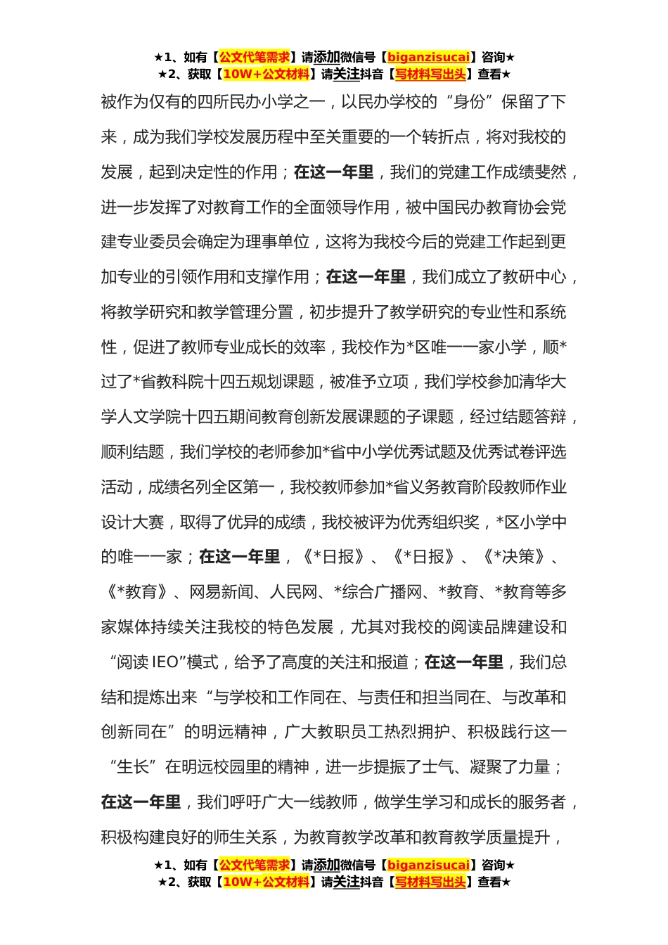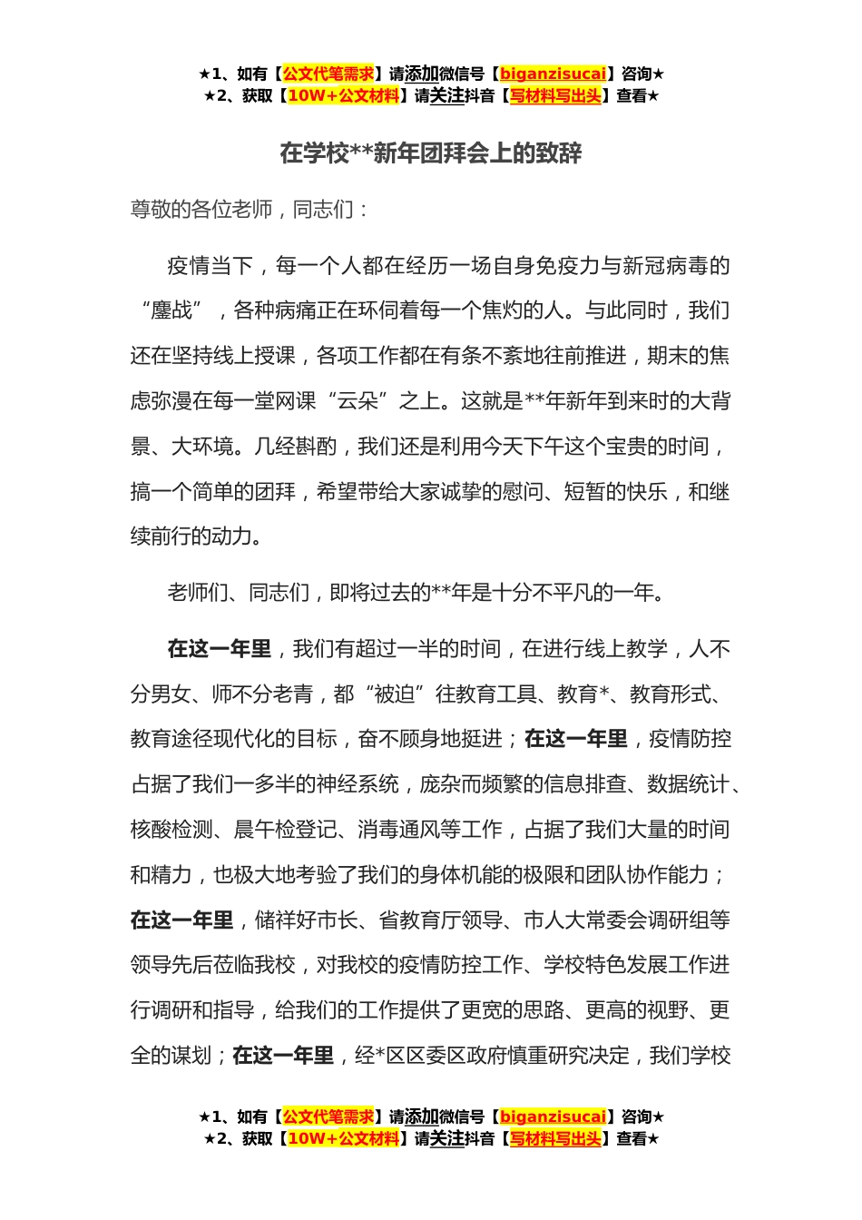 ★1、如有【公文代笔需求】请添加微信号【biganzisucai】咨询★★2、获取【10W+公文材料】请关注抖音【写材料写出头】查看★在学校**新年团拜会上的致辞尊敬的各位老师,同志们:疫情当下,每一个人都在经历一场自身免疫力与新冠病毒的“鏖战”,各种病痛正在环伺着每一个焦灼的人。与此同时,我们还在坚持线上授课,各项工作都在有条不紊地往前推进,期末的焦虑弥漫在每一堂网课“云朵”之上。这就是**年新年到来时的大背景、大环境。几经斟酌,我们还是利用今天下午这个宝贵的时间,搞一个简单的团拜,希望带给大家诚挚的慰问、短暂的快乐,和继续前行的动力。老师们、同志们,即将过去的**年是十分不平凡的一年。在这一年里,我们有超过一半的时间,在进行线上教学,人不分男女、师不分老青,都“被迫”往教育...