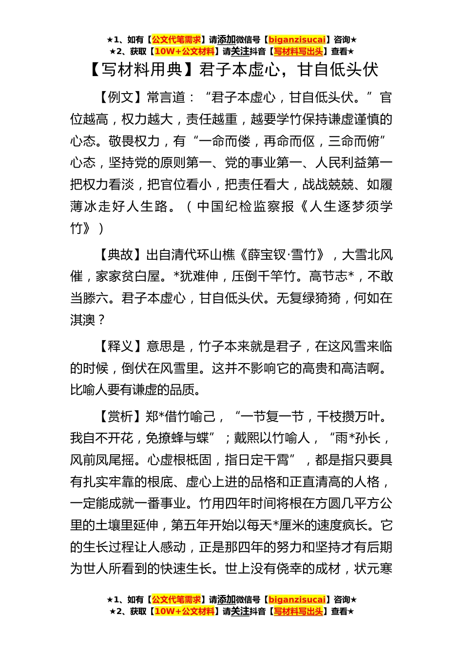 ★1、如有【公文代笔需求】请添加微信号【biganzisucai】咨询★★2、获取【10W+公文材料】请关注抖音【写材料写出头】查看★★1、如有【公文代笔需求】请添加微信号【biganzisucai】咨询★★2、获取【10W+公文材料】请关注抖音【写材料写出头】查看★★1、如有【公文代笔需求】请添加微信号【biganzisucai】咨询★★2、获取【10W+公文材料】请关注抖音【写材料写出头】查看★【写材料用典】君子本虚心,甘自低头伏【例文】常言道:“君子本虚心,甘自低头伏。”官位越高,权力越大,责任越重,越要学竹保持谦虚谨慎的心态。敬畏权力,有“一命而偻,再命而伛,三命而俯”心态,坚持党的原则第一、党的事业第一、人民利益第一把权力看淡,把官位看小,把责任看大,战战兢兢、如履薄冰走好人生路。(中国纪检监察报...
