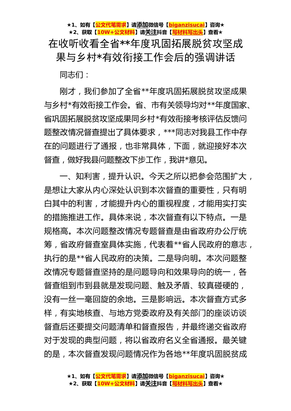 ★1、如有【公文代笔需求】请添加微信号【biganzisucai】咨询★★2、获取【10W+公文材料】请关注抖音【写材料写出头】查看★★1、如有【公文代笔需求】请添加微信号【biganzisucai】咨询★★2、获取【10W+公文材料】请关注抖音【写材料写出头】查看★★1、如有【公文代笔需求】请添加微信号【biganzisucai】咨询★★2、获取【10W+公文材料】请关注抖音【写材料写出头】查看★在收听收看全省**年度巩固拓展脱贫攻坚成果与乡村*有效衔接工作会后的强调讲话同志们:刚才,我们参加了全省**年度巩固拓展脱贫攻坚成果与乡村*有效衔接工作会。省、市有关领导均对**年度国家、省巩固拓展脱贫攻坚成果同乡村*有效衔接考核评估反馈问题整改情况督查提出了具体要求,***同志对我县工作中存在的问题进行了通报,也非常具体,...