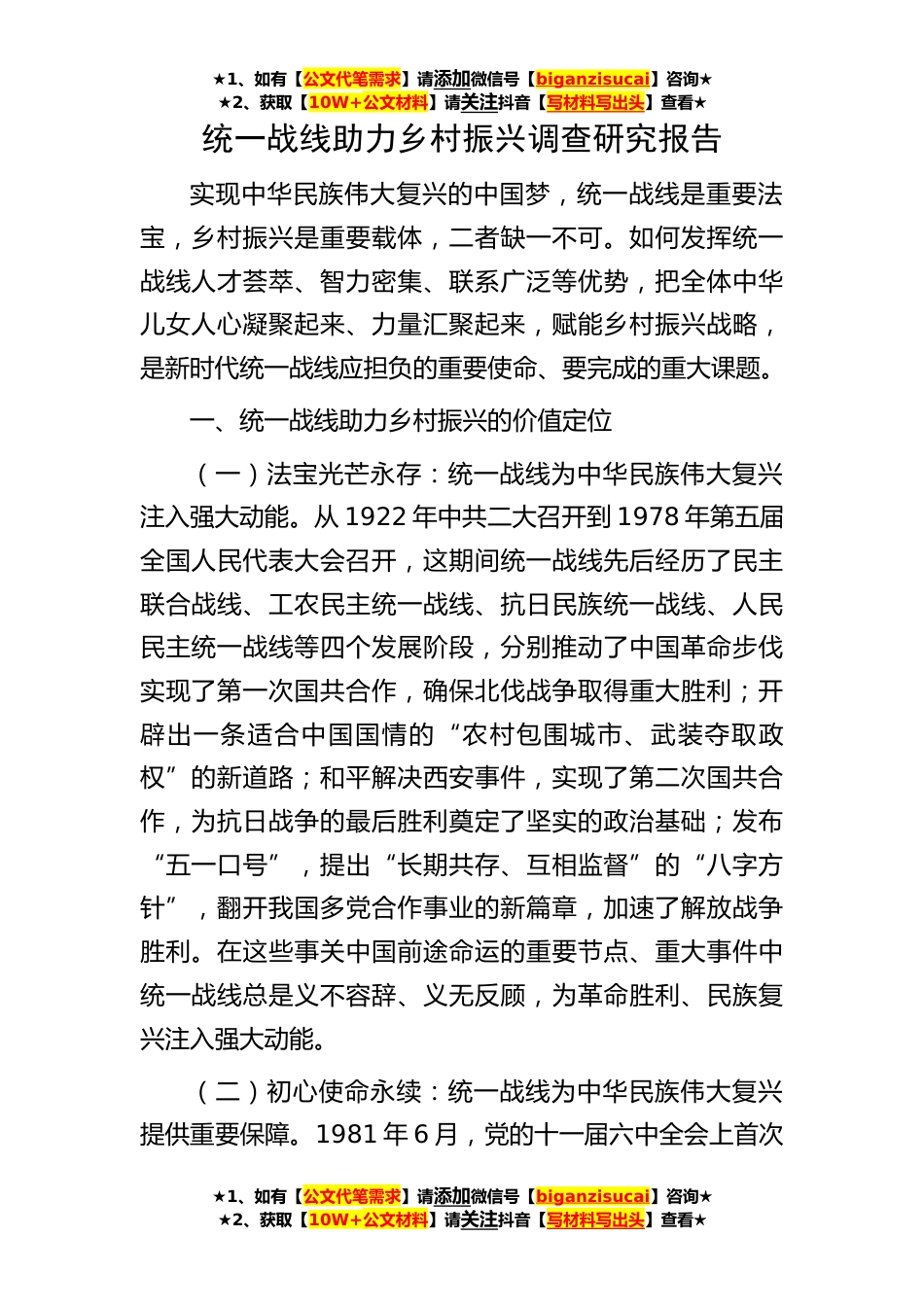 ★1、如有【公文代笔需求】请添加微信号【biganzisucai】咨询★★2、获取【10W+公文材料】请关注抖音【写材料写出头】查看★★1、如有【公文代笔需求】请添加微信号【biganzisucai】咨询★★2、获取【10W+公文材料】请关注抖音【写材料写出头】查看★★1、如有【公文代笔需求】请添加微信号【biganzisucai】咨询★★2、获取【10W+公文材料】请关注抖音【写材料写出头】查看★统一战线助力乡村振兴调查研究报告实现中华民族伟大复兴的中国梦,统一战线是重要法宝,乡村振兴是重要载体,二者缺一不可。如何发挥统一战线人才荟萃、智力密集、联系广泛等优势,把全体中华儿女人心凝聚起来、力量汇聚起来,赋能乡村振兴战略,是新时代统一战线应担负的重要使命、要完成的重大课题。一、统一战线助力乡村振兴的价值定位...