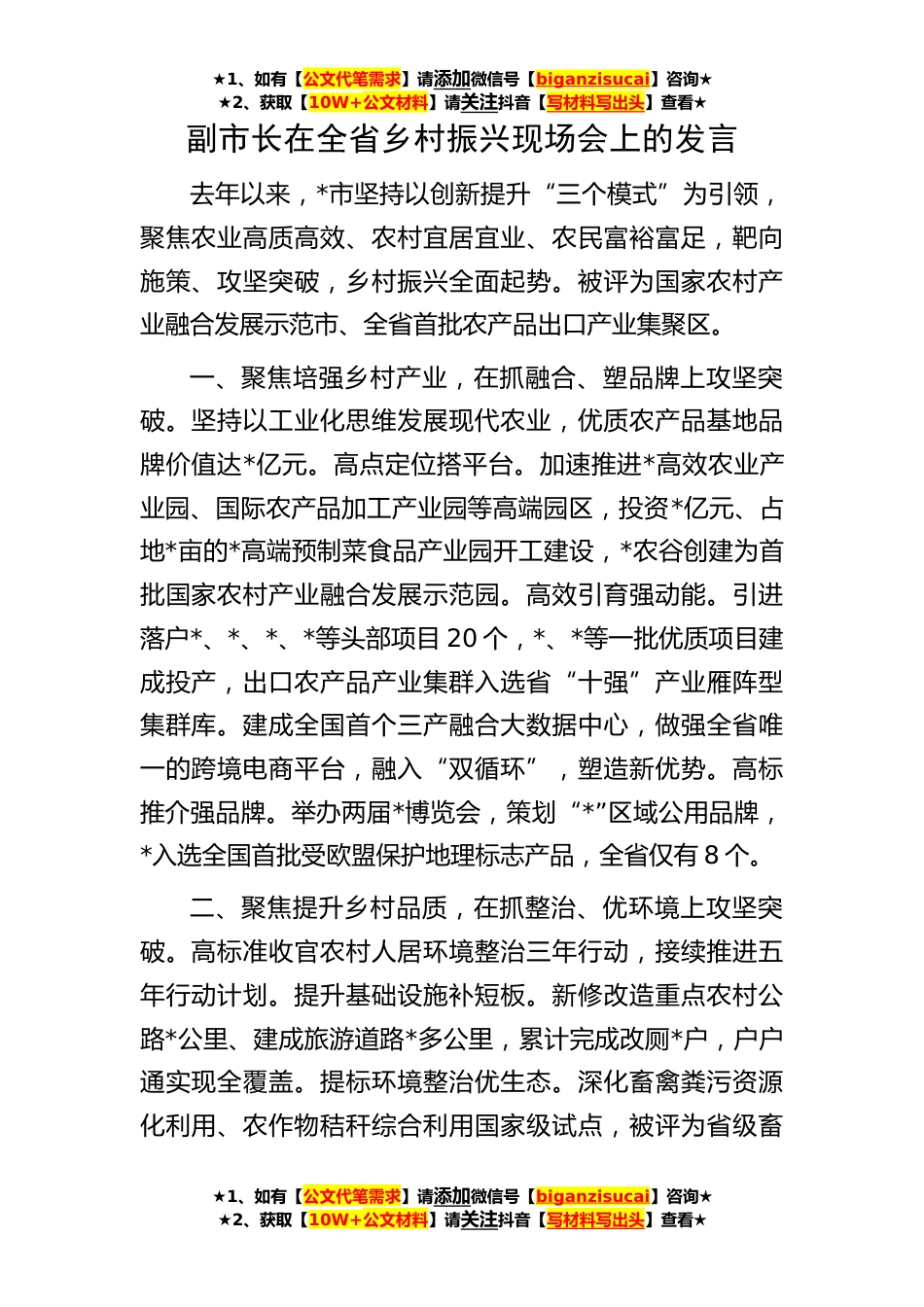 ★1、如有【公文代笔需求】请添加微信号【biganzisucai】咨询★★2、获取【10W+公文材料】请关注抖音【写材料写出头】查看★★1、如有【公文代笔需求】请添加微信号【biganzisucai】咨询★★2、获取【10W+公文材料】请关注抖音【写材料写出头】查看★★1、如有【公文代笔需求】请添加微信号【biganzisucai】咨询★★2、获取【10W+公文材料】请关注抖音【写材料写出头】查看★副市长在全省乡村振兴现场会上的发言去年以来,*市坚持以创新提升“三个模式”为引领,聚焦农业高质高效、农村宜居宜业、农民富裕富足,靶向施策、攻坚突破,乡村振兴全面起势。被评为国家农村产业融合发展示范市、全省首批农产品出口产业集聚区。一、聚焦培强乡村产业,在抓融合、塑品牌上攻坚突破。坚持以工业化思维发展现代农业,优质农...