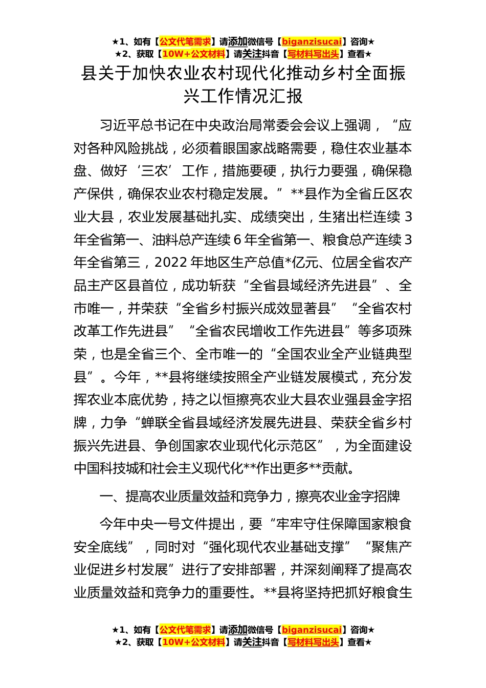 ★1、如有【公文代笔需求】请添加微信号【biganzisucai】咨询★★2、获取【10W+公文材料】请关注抖音【写材料写出头】查看★★1、如有【公文代笔需求】请添加微信号【biganzisucai】咨询★★2、获取【10W+公文材料】请关注抖音【写材料写出头】查看★★1、如有【公文代笔需求】请添加微信号【biganzisucai】咨询★★2、获取【10W+公文材料】请关注抖音【写材料写出头】查看★县关于加快农业农村现代化推动乡村全面振兴工作情况汇报习近平总书记在中央政治局常委会会议上强调,“应对各种风险挑战,必须着眼国家战略需要,稳住农业基本盘、做好‘三农’工作,措施要硬,执行力要强,确保稳产保供,确保农业农村稳定发展。”**县作为全省丘区农业大县,农业发展基础扎实、成绩突出,生猪出栏连续3年全省第一、油料总...