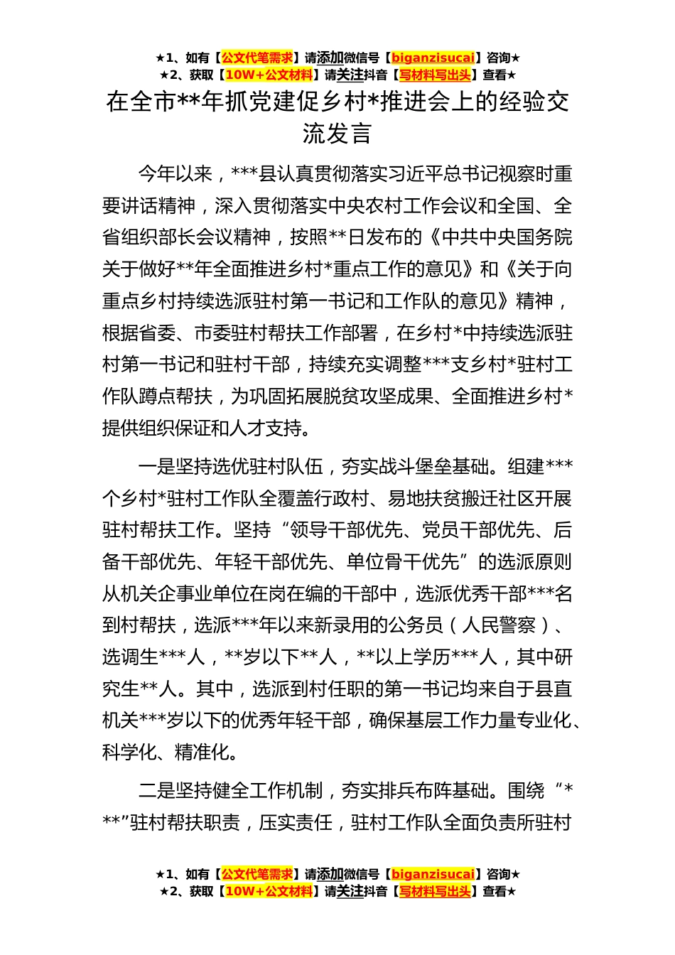★1、如有【公文代笔需求】请添加微信号【biganzisucai】咨询★★2、获取【10W+公文材料】请关注抖音【写材料写出头】查看★★1、如有【公文代笔需求】请添加微信号【biganzisucai】咨询★★2、获取【10W+公文材料】请关注抖音【写材料写出头】查看★★1、如有【公文代笔需求】请添加微信号【biganzisucai】咨询★★2、获取【10W+公文材料】请关注抖音【写材料写出头】查看★在全市**年抓党建促乡村*推进会上的经验交流发言今年以来,***县认真贯彻落实习近平总书记视察时重要讲话精神,深入贯彻落实中央农村工作会议和全国、全省组织部长会议精神,按照**日发布的《中共中央国务院关于做好**年全面推进乡村*重点工作的意见》和《关于向重点乡村持续选派驻村第一书记和工作队的意见》精神,根据省委、市委驻村帮扶...