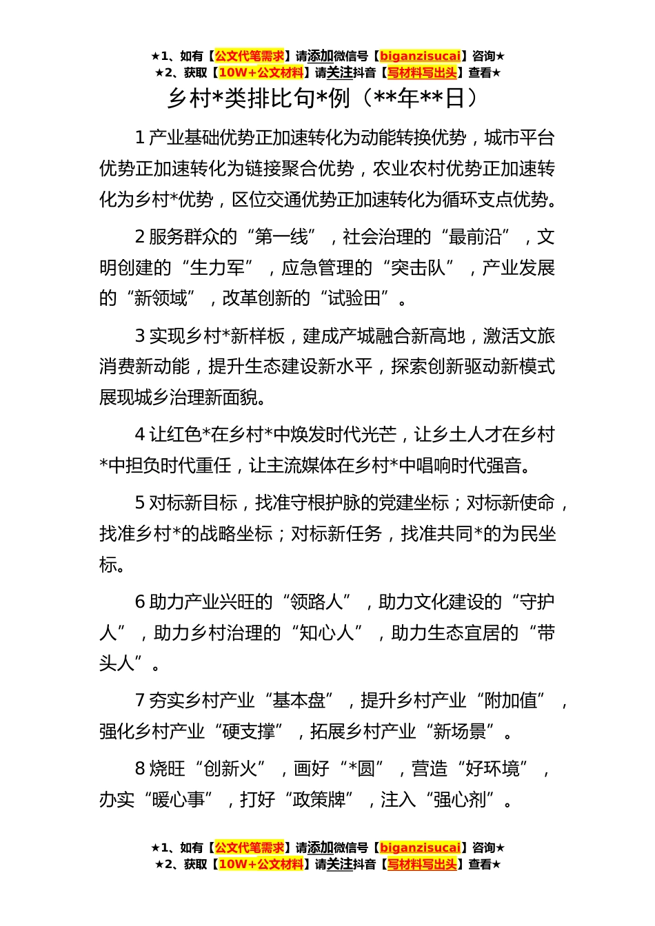 ★1、如有【公文代笔需求】请添加微信号【biganzisucai】咨询★★2、获取【10W+公文材料】请关注抖音【写材料写出头】查看★★1、如有【公文代笔需求】请添加微信号【biganzisucai】咨询★★2、获取【10W+公文材料】请关注抖音【写材料写出头】查看★★1、如有【公文代笔需求】请添加微信号【biganzisucai】咨询★★2、获取【10W+公文材料】请关注抖音【写材料写出头】查看★乡村*类排比句*例(**年**日)1产业基础优势正加速转化为动能转换优势,城市平台优势正加速转化为链接聚合优势,农业农村优势正加速转化为乡村*优势,区位交通优势正加速转化为循环支点优势。2服务群众的“第一线”,社会治理的“最前沿”,文明创建的“生力军”,应急管理的“突击队”,产业发展的“新领域”,改革创新的“试验田”。3实...