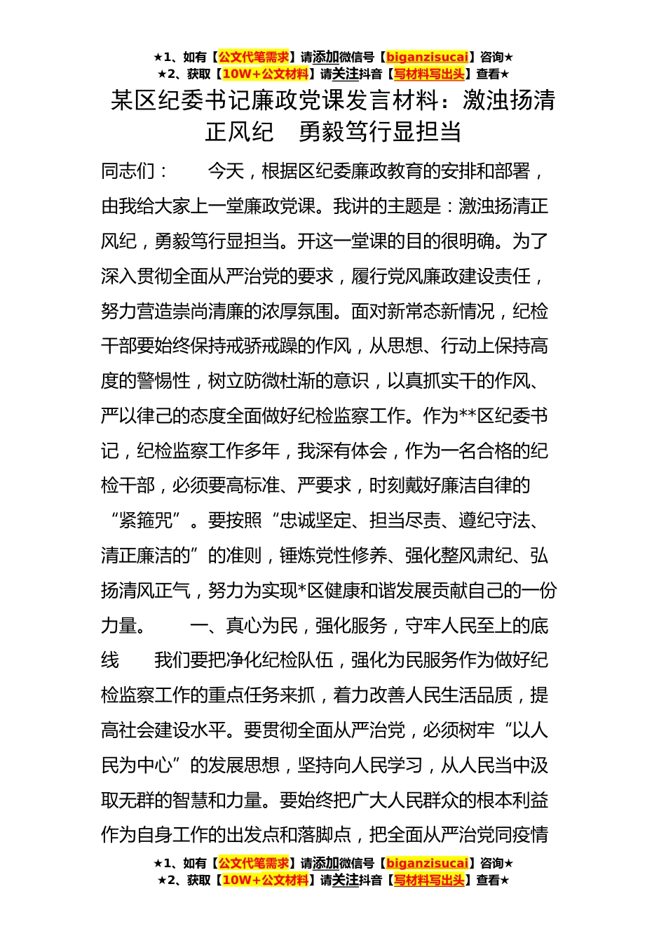 ★1、如有【公文代笔需求】请添加微信号【biganzisucai】咨询★★2、获取【10W+公文材料】请关注抖音【写材料写出头】查看★★1、如有【公文代笔需求】请添加微信号【biganzisucai】咨询★★2、获取【10W+公文材料】请关注抖音【写材料写出头】查看★★1、如有【公文代笔需求】请添加微信号【biganzisucai】咨询★★2、获取【10W+公文材料】请关注抖音【写材料写出头】查看★某区纪委书记廉政党课发言材料:激浊扬清正风纪勇毅笃行显担当同志们:今天,根据区纪委廉政教育的安排和部署,由我给大家上一堂廉政党课。我讲的主题是:激浊扬清正风纪,勇毅笃行显担当。开这一堂课的目的很明确。为了深入贯彻全面从严治党的要求,履行党风廉政建设责任,努力营造崇尚清廉的浓厚氛围。面对新常态新情况,纪检干部要始终...