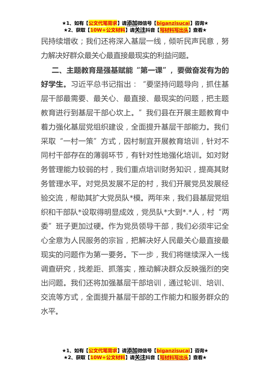 ★1、如有【公文代笔需求】请添加微信号【biganzisucai】咨询★★2、获取【10W+公文材料】请关注抖音【写材料写出头】查看★**年度主题教育读书班关于乡村*研讨交流发言扎实组织开展学习贯彻习近平新时代中国特色社会主义思想主题教育是衷心拥护“两个确立”、忠诚践行“两个维护”的政治检验,必须准确把握主题教育的总要求和目标任务,在深学细悟、笃信笃行上走在前、作表率,切实以主题教育的扎实成效,推动组织工作高质量发展。近段时间,本人通过个人自学,深入学习了党的二十大报告、党章等学习材料,对新思想有了更进一步的认识。下面,结合工作实际,谈几点心得体会。一、主题教育是立志明理“第一课”,要做初心笃定的好学生。习近平总书记指出:“初心易得,始终难守。”回首过去,我们在贯彻落实习近平...