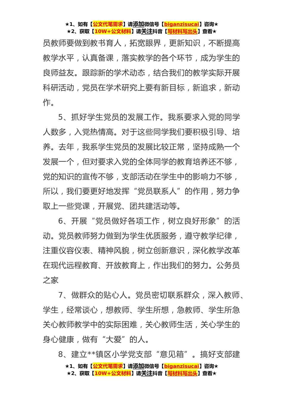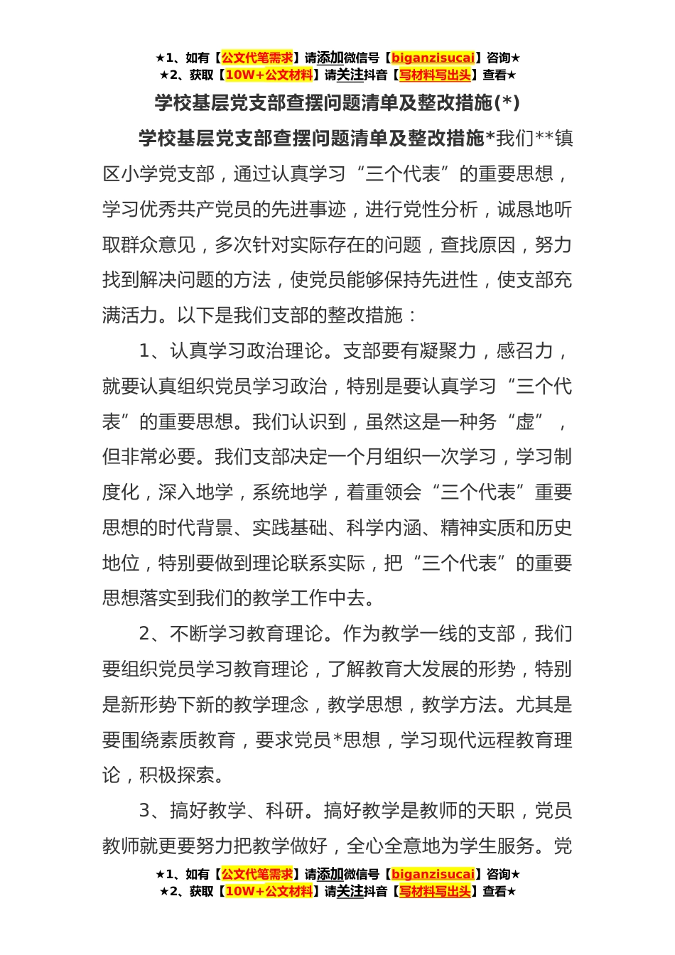 ★1、如有【公文代笔需求】请添加微信号【biganzisucai】咨询★★2、获取【10W+公文材料】请关注抖音【写材料写出头】查看★学校基层党支部查摆问题清单及整改措施(*)学校基层党支部查摆问题清单及整改措施*我们**镇区小学党支部,通过认真学习“三个代表”的重要思想,学习优秀共产党员的先进事迹,进行党性分析,诚恳地听取群众意见,多次针对实际存在的问题,查找原因,努力找到解决问题的方法,使党员能够保持先进性,使支部充满活力。以下是我们支部的整改措施:1、认真学习政治理论。支部要有凝聚力,感召力,就要认真组织党员学习政治,特别是要认真学习“三个代表”的重要思想。我们认识到,虽然这是一种务“虚”,但非常必要。我们支部决定一个月组织一次学习,学习制度化,深入地学,系统地学,着重领会...