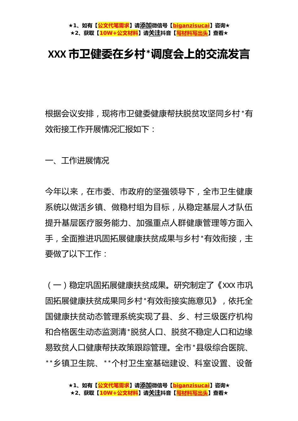 ★1、如有【公文代笔需求】请添加微信号【biganzisucai】咨询★★2、获取【10W+公文材料】请关注抖音【写材料写出头】查看★XXX市卫健委在乡村*调度会上的交流发言根据会议安排,现将市卫健委健康帮扶脱贫攻坚同乡村*有效衔接工作开展情况汇报如下:一、工作进展情况今年以来,在市委、市政府的坚强领导下,全市卫生健康系统以做活乡镇、做稳村组为目标,从稳定基层人才队伍提升基层医疗服务能力、加强重点人群健康管理等方面入手,全面推进巩固拓展健康扶贫成果与乡村*有效衔接,主要做了以下工作:(一)稳定巩固拓展健康扶贫成果。研究制定了《XXX市巩固拓展健康扶贫成果同乡村*有效衔接实施意见》,依托全国健康扶贫动态管理系统实现了县、乡、村三级医疗机构和合格医生动态监测清*脱贫人口、脱贫不稳定人口和...