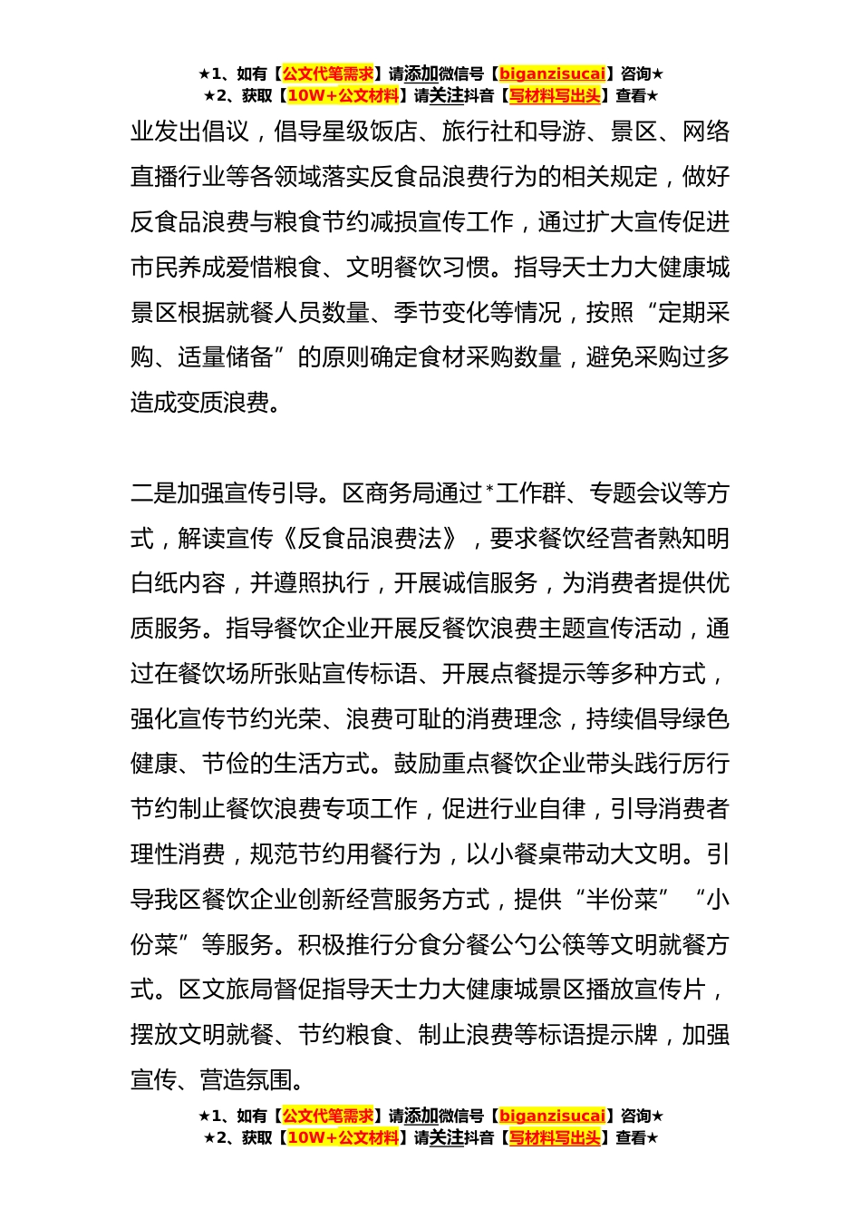 ★1、如有【公文代笔需求】请添加微信号【biganzisucai】咨询★★2、获取【10W+公文材料】请关注抖音【写材料写出头】查看★有关于**年上半年XX区反食品浪费与粮食节约减损工作总结我区高度重视反食品浪费与粮食节约减损工作,严格按照《XXX市反食品浪费与粮食节约减损工作方案》要求落实各项工作任务,**年上半年开展情况如下:一、工作进展(一)加强餐饮行业经营行为管理一是强化日常督导检查。组织开展日常性排查,尤其是在重要传统节日期间,对辰悦广场、裕德隆饭店、立绅酒楼惠宾饭店、贤福记等商综、餐饮企业开展检查,重点检查经营者食品储存、运输、加工条件,临近保质期的食品分类管理,督促企业强化食品安全意识,落实食品安全责任目前,区内重点餐饮企业均已明示服务规范,并执行行业标准。同时,通过...