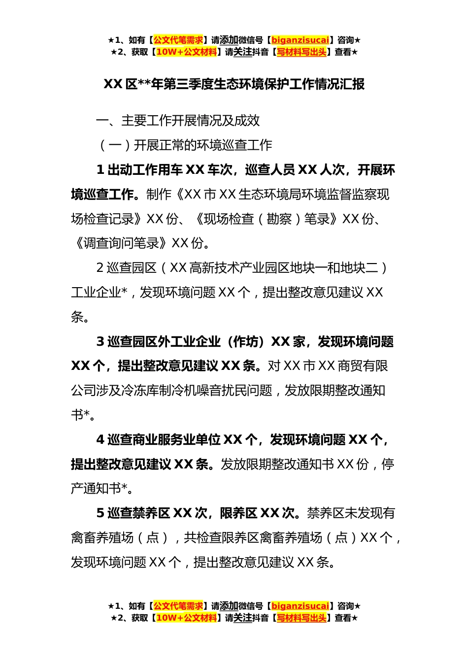 ★1、如有【公文代笔需求】请添加微信号【biganzisucai】咨询★★2、获取【10W+公文材料】请关注抖音【写材料写出头】查看★XX区**年第三季度生态环境保护工作情况汇报一、主要工作开展情况及成效(一)开展正常的环境巡查工作1出动工作用车XX车次,巡查人员XX人次,开展环境巡查工作。制作《XX市XX生态环境局环境监督监察现场检查记录》XX份、《现场检查(勘察)笔录》XX份、《调查询问笔录》XX份。2巡查园区(XX高新技术产业园区地块一和地块二)工业企业*,发现环境问题XX个,提出整改意见建议XX条。3巡查园区外工业企业(作坊)XX家,发现环境问题XX个,提出整改意见建议XX条。对XX市XX商贸有限公司涉及冷冻库制冷机噪音扰民问题,发放限期整改通知书*。4巡查商业服务业单位XX个,发现环境问题XX个,提出整改...