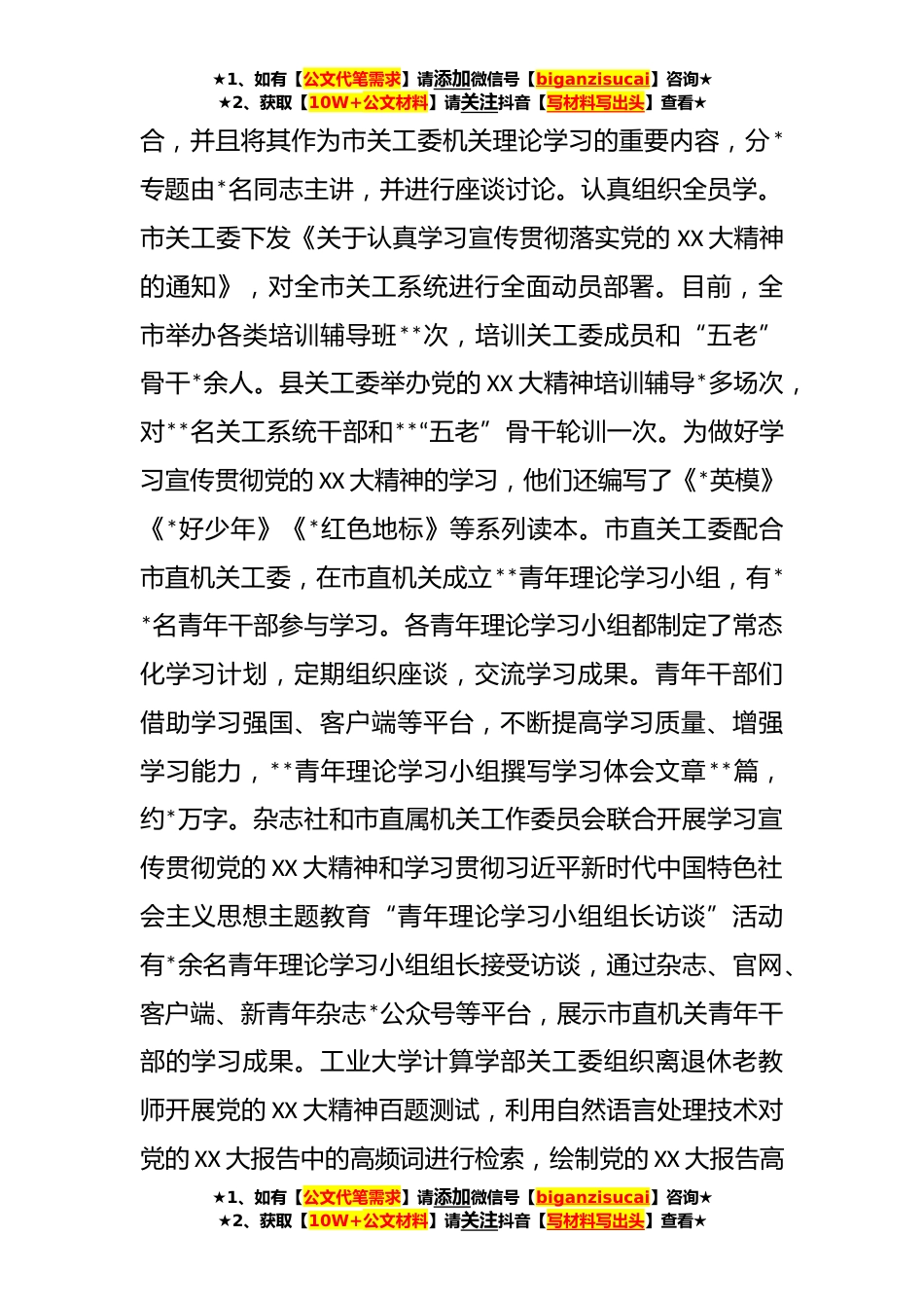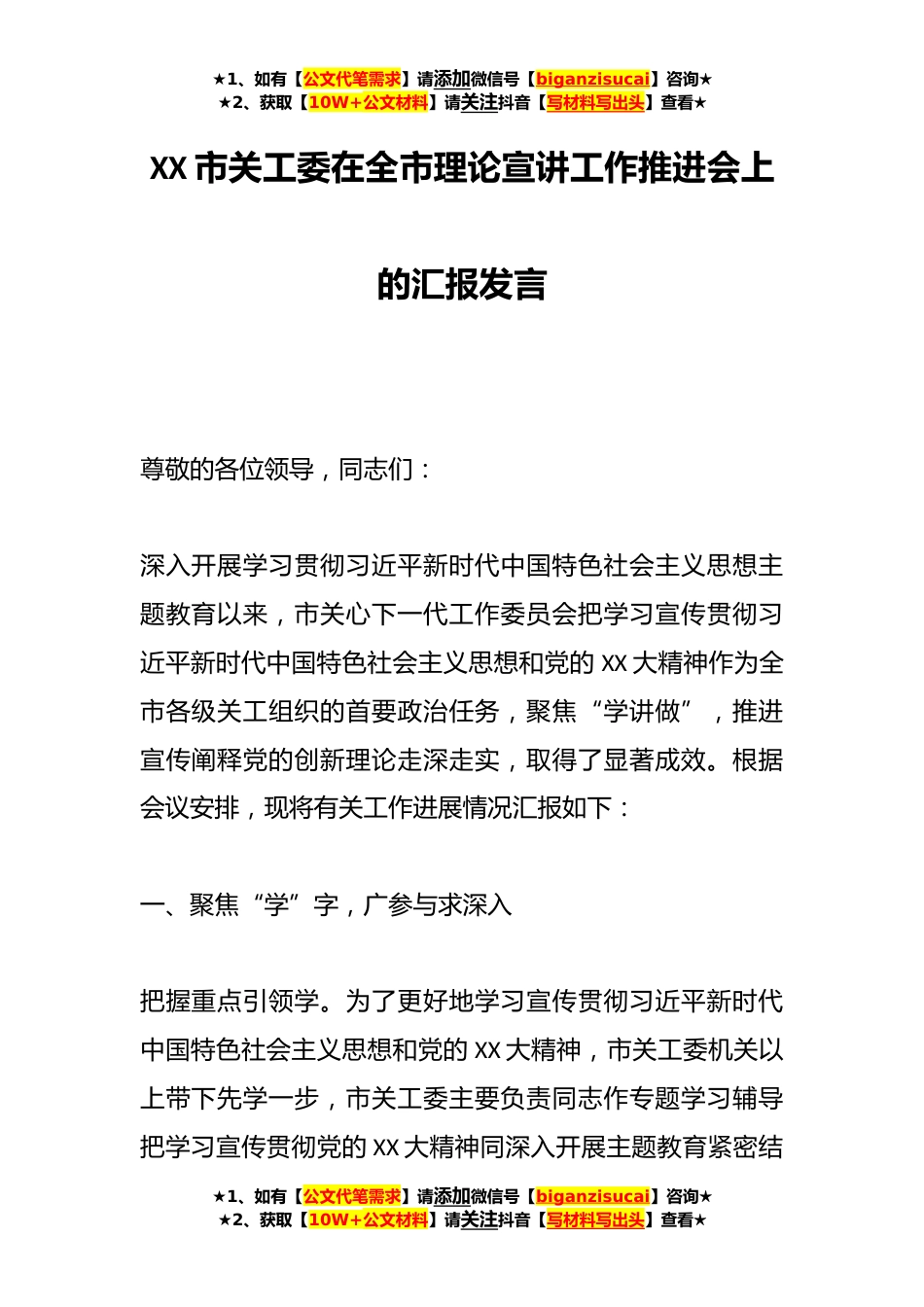 ★1、如有【公文代笔需求】请添加微信号【biganzisucai】咨询★★2、获取【10W+公文材料】请关注抖音【写材料写出头】查看★XX市关工委在全市理论宣讲工作推进会上的汇报发言尊敬的各位领导,同志们:深入开展学习贯彻习近平新时代中国特色社会主义思想主题教育以来,市关心下一代工作委员会把学习宣传贯彻习近平新时代中国特色社会主义思想和党的XX大精神作为全市各级关工组织的首要政治任务,聚焦“学讲做”,推进宣传阐释党的创新理论走深走实,取得了显著成效。根据会议安排,现将有关工作进展情况汇报如下:一、聚焦“学”字,广参与求深入把握重点引领学。为了更好地学习宣传贯彻习近平新时代中国特色社会主义思想和党的XX大精神,市关工委机关以上带下先学一步,市关工委主要负责同志作专题学习辅导把学习...