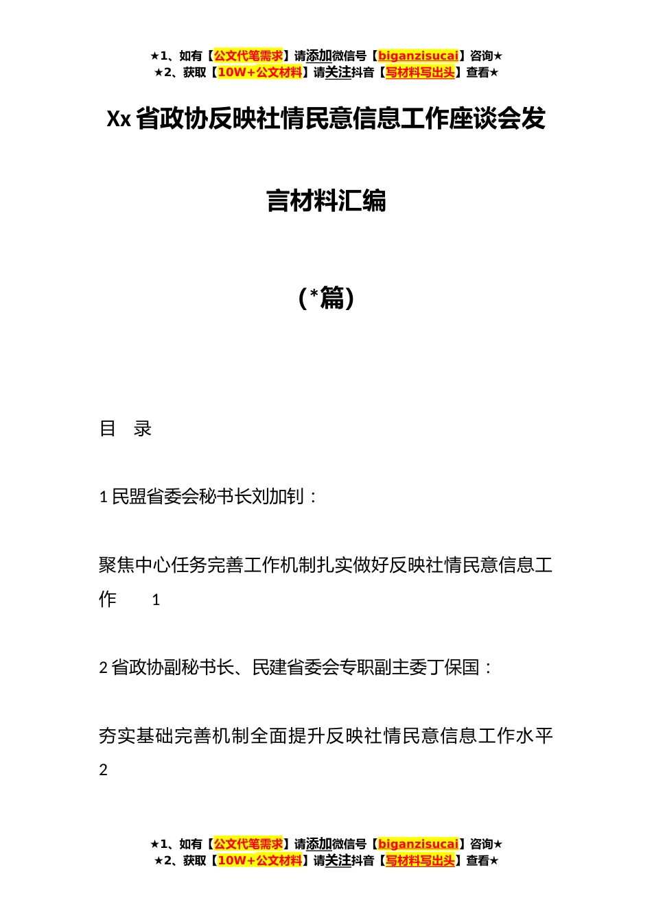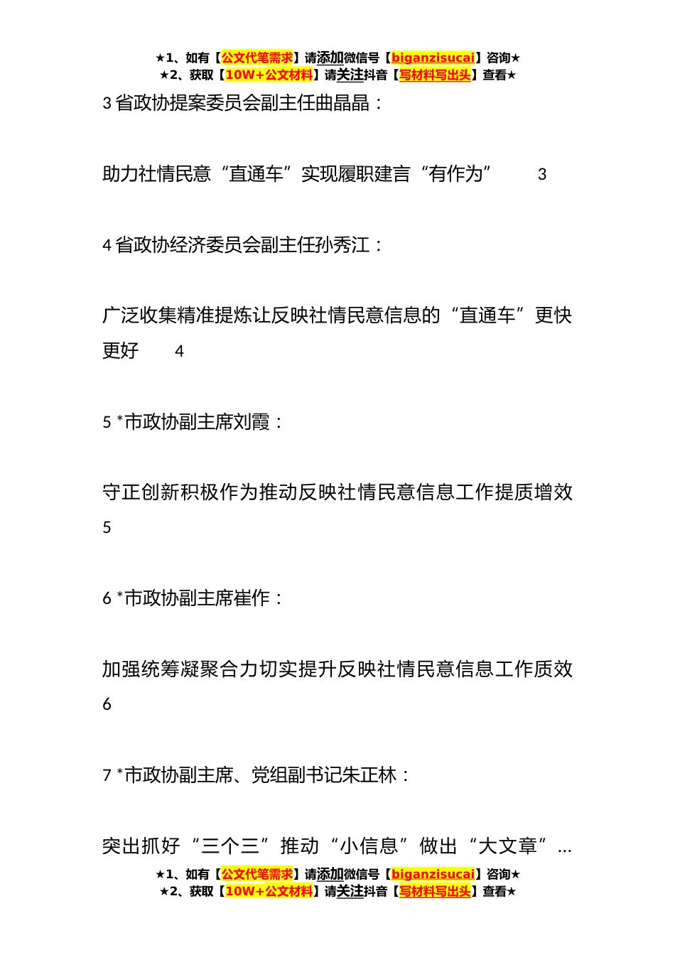 ★1、如有【公文代笔需求】请添加微信号【biganzisucai】咨询★★2、获取【10W+公文材料】请关注抖音【写材料写出头】查看★Xx省政协反映社情民意信息工作座谈会发言材料汇编(*篇)目录1民盟省委会秘书长刘加钊:聚焦中心任务完善工作机制扎实做好反映社情民意信息工作12省政协副秘书长、民建省委会专职副主委丁保国:夯实基础完善机制全面提升反映社情民意信息工作水平2★1、如有【公文代笔需求】请添加微信号【biganzisucai】咨询★★2、获取【10W+公文材料】请关注抖音【写材料写出头】查看★★1、如有【公文代笔需求】请添加微信号【biganzisucai】咨询★★2、获取【10W+公文材料】请关注抖音【写材料写出头】查看★3省政协提案委员会副主任曲晶晶:助力社情民意“直通车”实现履职建言“有作为”34省政协经...