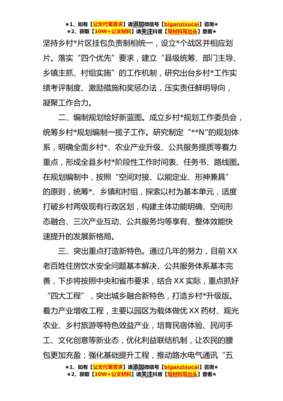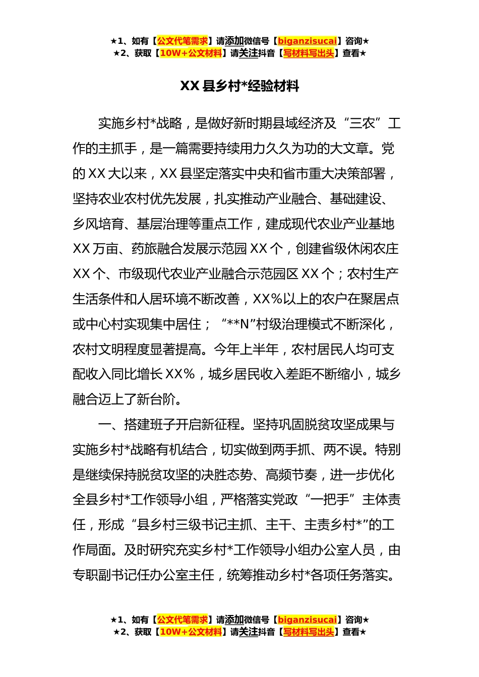 ★1、如有【公文代笔需求】请添加微信号【biganzisucai】咨询★★2、获取【10W+公文材料】请关注抖音【写材料写出头】查看★XX县乡村*经验材料实施乡村*战略,是做好新时期县域经济及“三农”工作的主抓手,是一篇需要持续用力久久为功的大文章。党的XX大以来,XX县坚定落实中央和省市重大决策部署,坚持农业农村优先发展,扎实推动产业融合、基础建设、乡风培育、基层治理等重点工作,建成现代农业产业基地XX万亩、药旅融合发展示范园XX个,创建省级休闲农庄XX个、市级现代农业产业融合示范园区XX个;农村生产生活条件和人居环境不断改善,XX%以上的农户在聚居点或中心村实现集中居住;“**N”村级治理模式不断深化,农村文明程度显著提高。今年上半年,农村居民人均可支配收入同比增长XX%,城乡居民收入差距不...