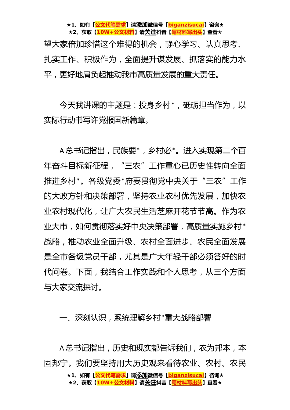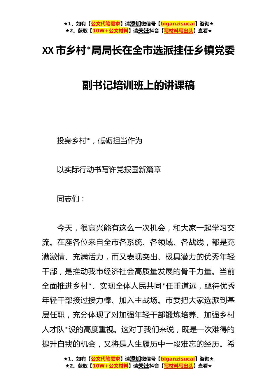 ★1、如有【公文代笔需求】请添加微信号【biganzisucai】咨询★★2、获取【10W+公文材料】请关注抖音【写材料写出头】查看★XX市乡村*局局长在全市选派挂任乡镇党委副书记培训班上的讲课稿投身乡村*,砥砺担当作为以实际行动书写许党报国新篇章同志们:今天,很高兴能有这么一次机会,和大家一起学习交流。在座各位来自全市各系统、各领域、各战线,都是充满激情、充满活力,而又表现突出、极具潜力的优秀年轻干部,是推动我市经济社会高质量发展的骨干力量。当前全面推进乡村*、实现全体人民共同*任重道远,亟待优秀年轻干部接过接力棒、加入主战场。市委把大家选派到基层任职,充分体现了对加强年轻干部锻炼培养、加强乡村人才队*设的高度重视。这对于我们来说,既是一次难得的提升自我的机会,又将是人生履历中...