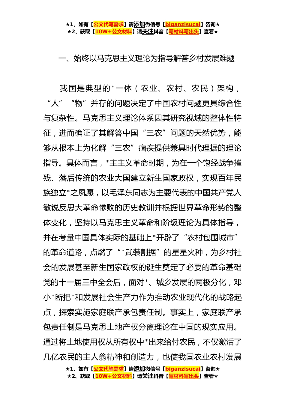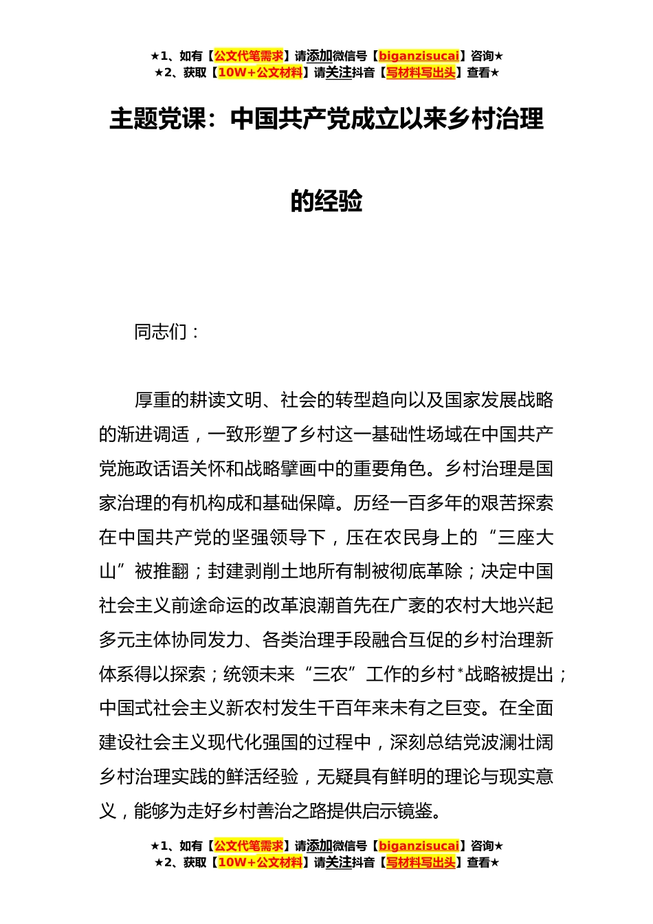★1、如有【公文代笔需求】请添加微信号【biganzisucai】咨询★★2、获取【10W+公文材料】请关注抖音【写材料写出头】查看★主题党课:中国共产党成立以来乡村治理的经验同志们:厚重的耕读文明、社会的转型趋向以及国家发展战略的渐进调适,一致形塑了乡村这一基础性场域在中国共产党施政话语关怀和战略擘画中的重要角色。乡村治理是国家治理的有机构成和基础保障。历经一百多年的艰苦探索在中国共产党的坚强领导下,压在农民身上的“三座大山”被推翻;封建剥削土地所有制被彻底革除;决定中国社会主义前途命运的改革浪潮首先在广袤的农村大地兴起多元主体协同发力、各类治理手段融合互促的乡村治理新体系得以探索;统领未来“三农”工作的乡村*战略被提出;中国式社会主义新农村发生千百年来未有之巨变。在全面...