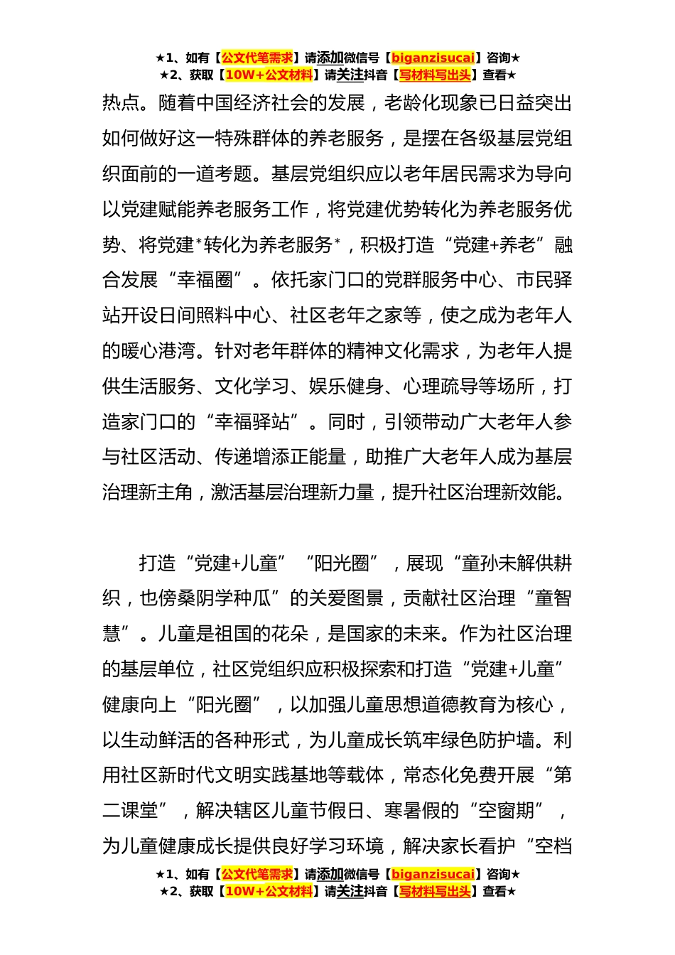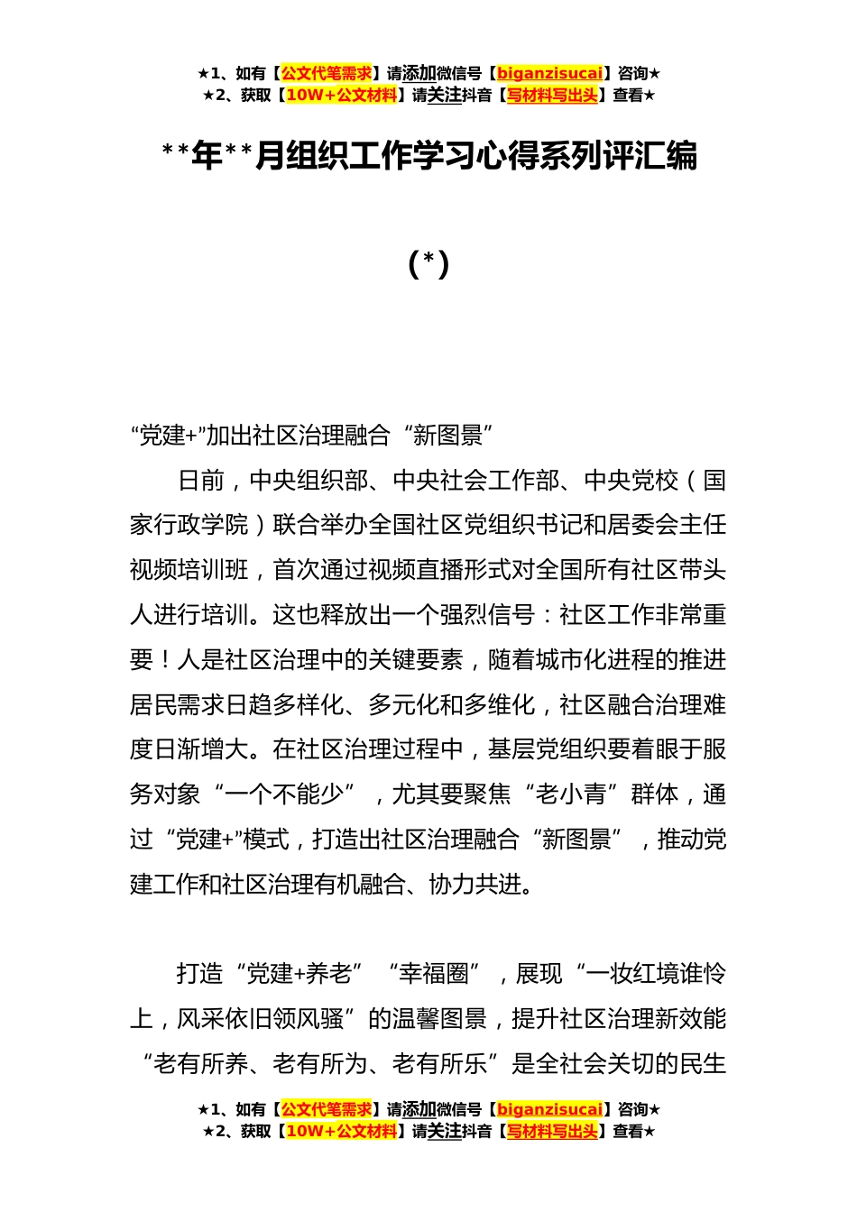 ★1、如有【公文代笔需求】请添加微信号【biganzisucai】咨询★★2、获取【10W+公文材料】请关注抖音【写材料写出头】查看★**年**月组织工作学习心得系列评汇编(*)“党建+”加出社区治理融合“新图景”日前,中央组织部、中央社会工作部、中央党校(国家行政学院)联合举办全国社区党组织书记和居委会主任视频培训班,首次通过视频直播形式对全国所有社区带头人进行培训。这也释放出一个强烈信号:社区工作非常重要!人是社区治理中的关键要素,随着城市化进程的推进居民需求日趋多样化、多元化和多维化,社区融合治理难度日渐增大。在社区治理过程中,基层党组织要着眼于服务对象“一个不能少”,尤其要聚焦“老小青”群体,通过“党建+”模式,打造出社区治理融合“新图景”,推动党建工作和社区治理有机融合...