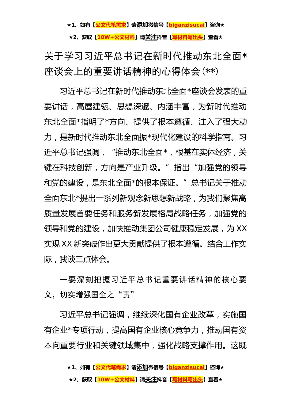 ★1、如有【公文代笔需求】请添加微信号【biganzisucai】咨询★★2、获取【10W+公文材料】请关注抖音【写材料写出头】查看★关于学习习近平总书记在新时代推动东北全面*座谈会上的重要讲话精神的心得体会(**)习近平总书记在新时代推动东北全面*座谈会发表的重要讲话,高屋建瓴、思想深邃、内涵丰富,为新时代推动东北全面*指明了*方向、提供了根本遵循、注入了强大动力,是新时代推动东北全面振*现代化建设的科学指南。习近平总书记强调,“推动东北全面*,根基在实体经济,关键在科技创新,方向是产业升级。”指出“加强党的领导和党的建设,是东北全面*的根本保证。”总书记关于推动全面东北*提出一系列新观念新思想新战略,为我们聚焦高质量发展首要任务和服务新发展格局战略任务,加强党的领导和党的建设,加...