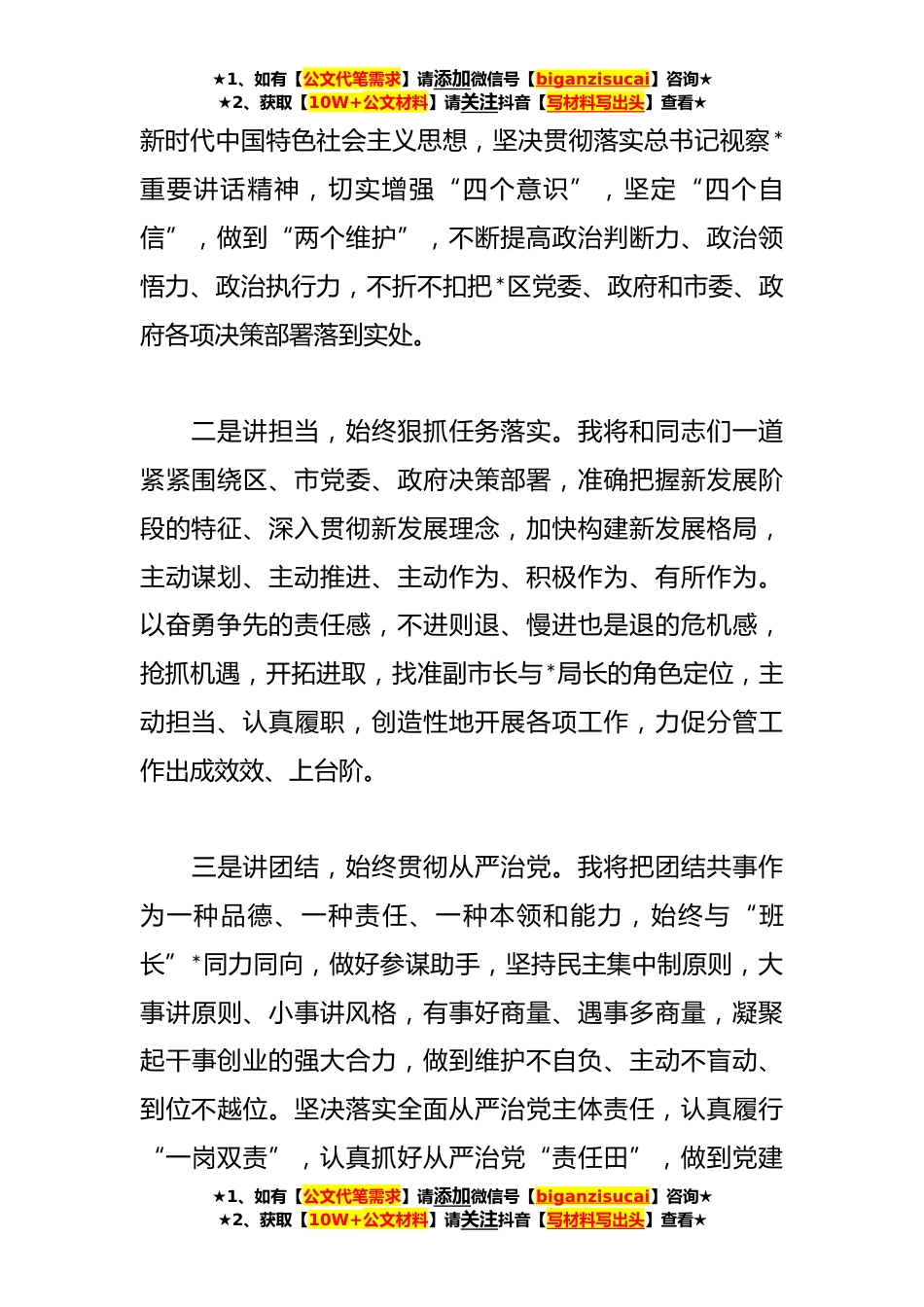 ★1、如有【公文代笔需求】请添加微信号【biganzisucai】咨询★★2、获取【10W+公文材料】请关注抖音【写材料写出头】查看★XX市副市长**年任职表态发言尊敬的*,各位领导、同志们:今天,*区党委决定我到*市工作,我坚决服从组织决定,衷心感谢组织对我的信任。我也清醒地认识到这既是一种莫大的荣誉,也是一份莫大的责任。*是我区一座历史悠久的工业城市,来到*,对我而言,是一个新的起点、新的考验,我将持续加强学习,虚心向在座的各位领导和同志们学习、向实践学习、向群众学习不断提高自身的领导能力和工作水平,尽快适应新环境、迅速转变新角色,在市委、市政府的坚强领导下,围绕中心、服务大局,不负嘱托、担当使命,全力推进*市各项事业高质量发展,为努力建设黄河流域生态保护和高质量发展先行区作出...