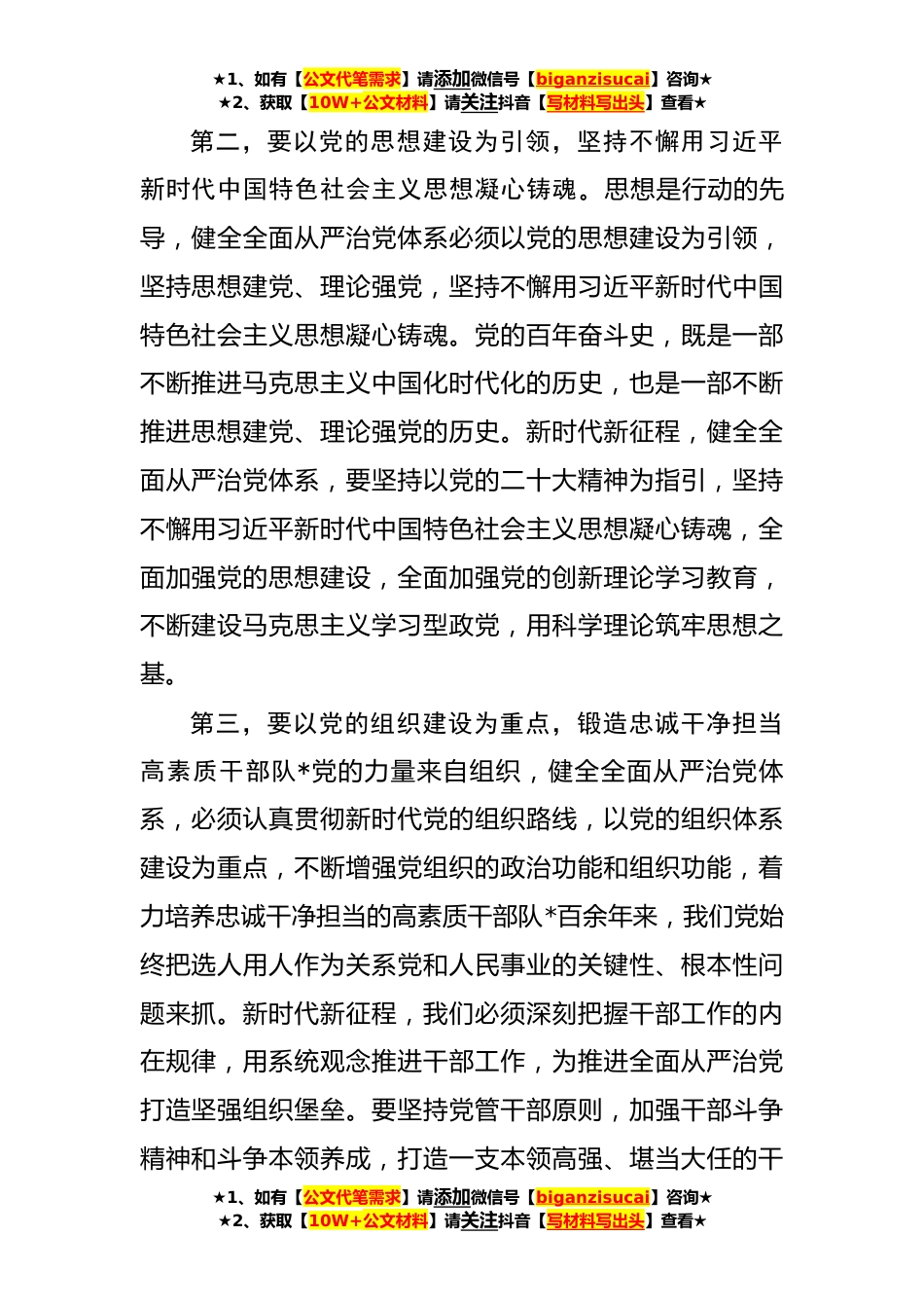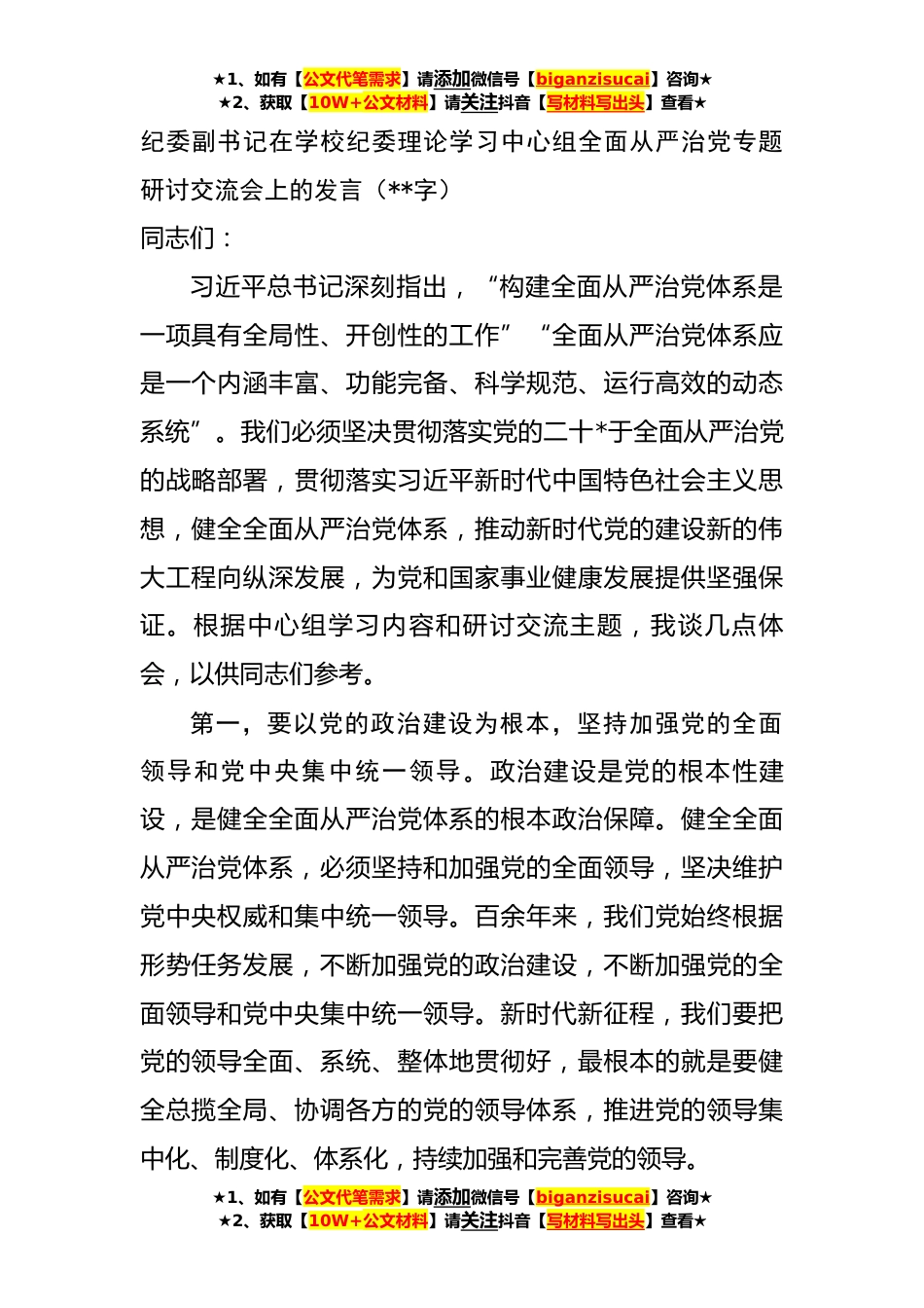 ★1、如有【公文代笔需求】请添加微信号【biganzisucai】咨询★★2、获取【10W+公文材料】请关注抖音【写材料写出头】查看★纪委副书记在学校纪委理论学习中心组全面从严治党专题研讨交流会上的发言(**字)同志们:习近平总书记深刻指出,“构建全面从严治党体系是一项具有全局性、开创性的工作”“全面从严治党体系应是一个内涵丰富、功能完备、科学规范、运行高效的动态系统”。我们必须坚决贯彻落实党的二十*于全面从严治党的战略部署,贯彻落实习近平新时代中国特色社会主义思想,健全全面从严治党体系,推动新时代党的建设新的伟大工程向纵深发展,为党和国家事业健康发展提供坚强保证。根据中心组学习内容和研讨交流主题,我谈几点体会,以供同志们参考。第一,要以党的政治建设为根本,坚持加强党的全面领...