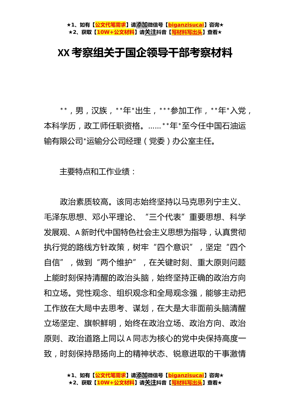 ★1、如有【公文代笔需求】请添加微信号【biganzisucai】咨询★★2、获取【10W+公文材料】请关注抖音【写材料写出头】查看★XX考察组关于国企领导干部考察材料**,男,汉族,**年*出生,***参加工作,**年*入党,本科学历,政工师任职资格。……**年*至今任中国石油运输有限公司*运输分公司经理(党委)办公室主任。主要特点和工作业绩:政治素质较高。该同志始终坚持以马克思列宁主义、毛泽东思想、邓小平理论、“三个代表”重要思想、科学发展观、A新时代中国特色社会主义思想为指导,认真贯彻执行党的路线方针政策,树牢“四个意识”,坚定“四个自信”,做到“两个维护”,在关键时刻、重大原则问题上能时刻保持清醒的政治头脑,始终坚持正确的政治方向和立场。党性观念、组织观念和全局观念强,能够主动把工...