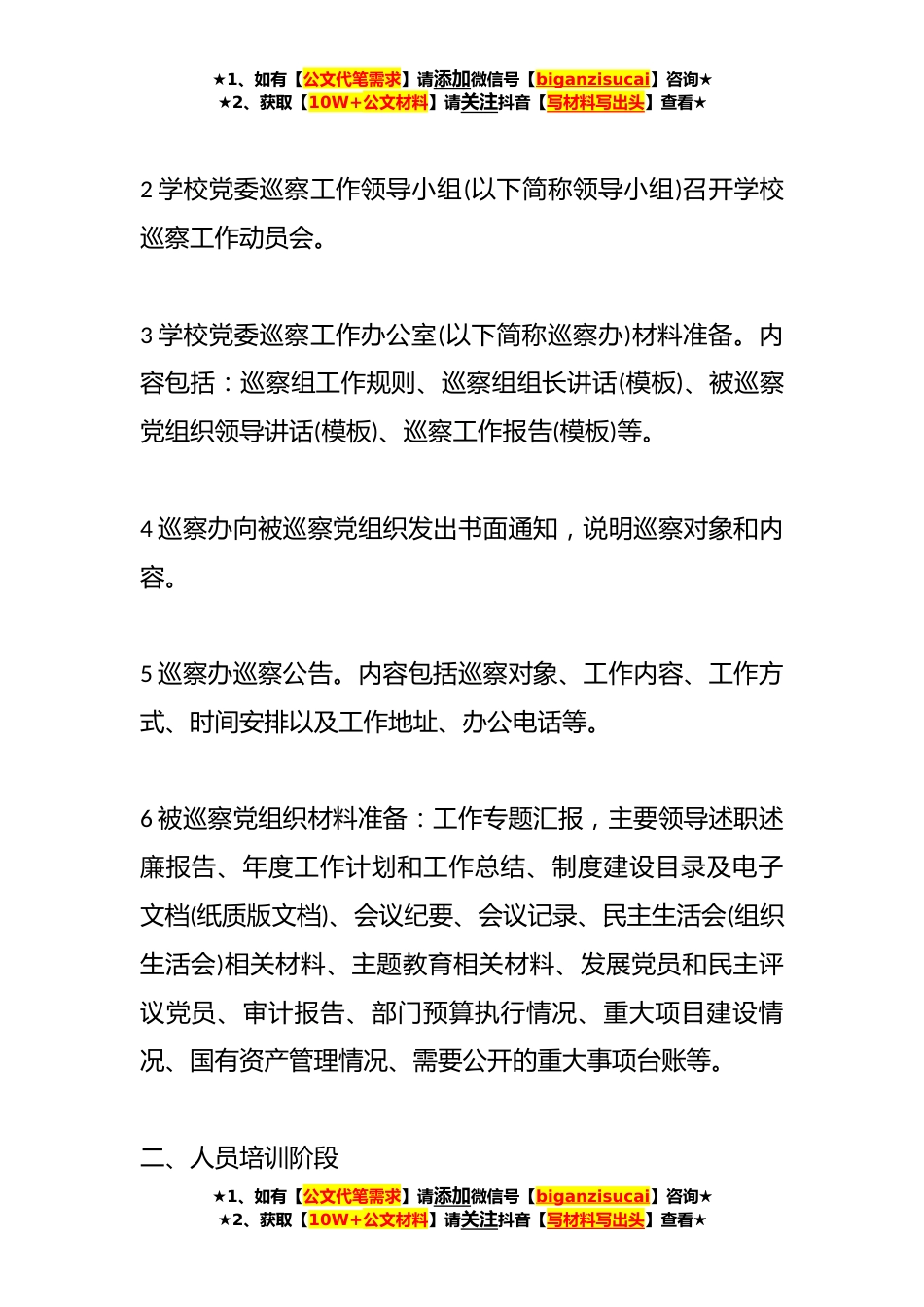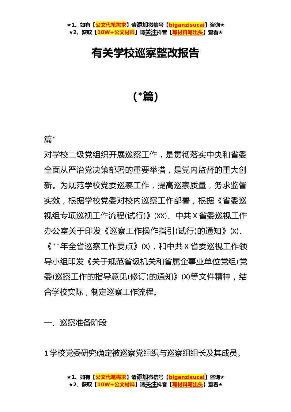 ★1、如有【公文代笔需求】请添加微信号【biganzisucai】咨询★★2、获取【10W+公文材料】请关注抖音【写材料写出头】查看★有关学校巡察整改报告(*篇)篇*对学校二级党组织开展巡察工作,是贯彻落实中央和省委全面从严治党决策部署的重要举措,是党内监督的重大创新。为规范学校党委巡察工作,提高巡察质量,务求监督实效,根据学校党委对校内巡察工作部署,根据《省委巡视组专项巡视工作流程(试行)》(XX)、中共X省委巡视工作办公室关于印发《巡察工作操作指引(试行)的通知》(X)、《**年全省巡察工作要点》(X),和中共X省委巡视工作领导小组印发《关于规范省级机关和省属企事业单位党组(党委)巡察工作的指导意见(修订)的通知》(X)等文件精神,结合学校实际,制定巡察工作流程。一、巡察准备阶段1学校党委研究确...