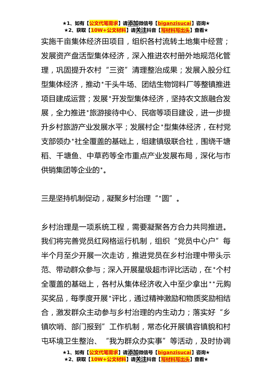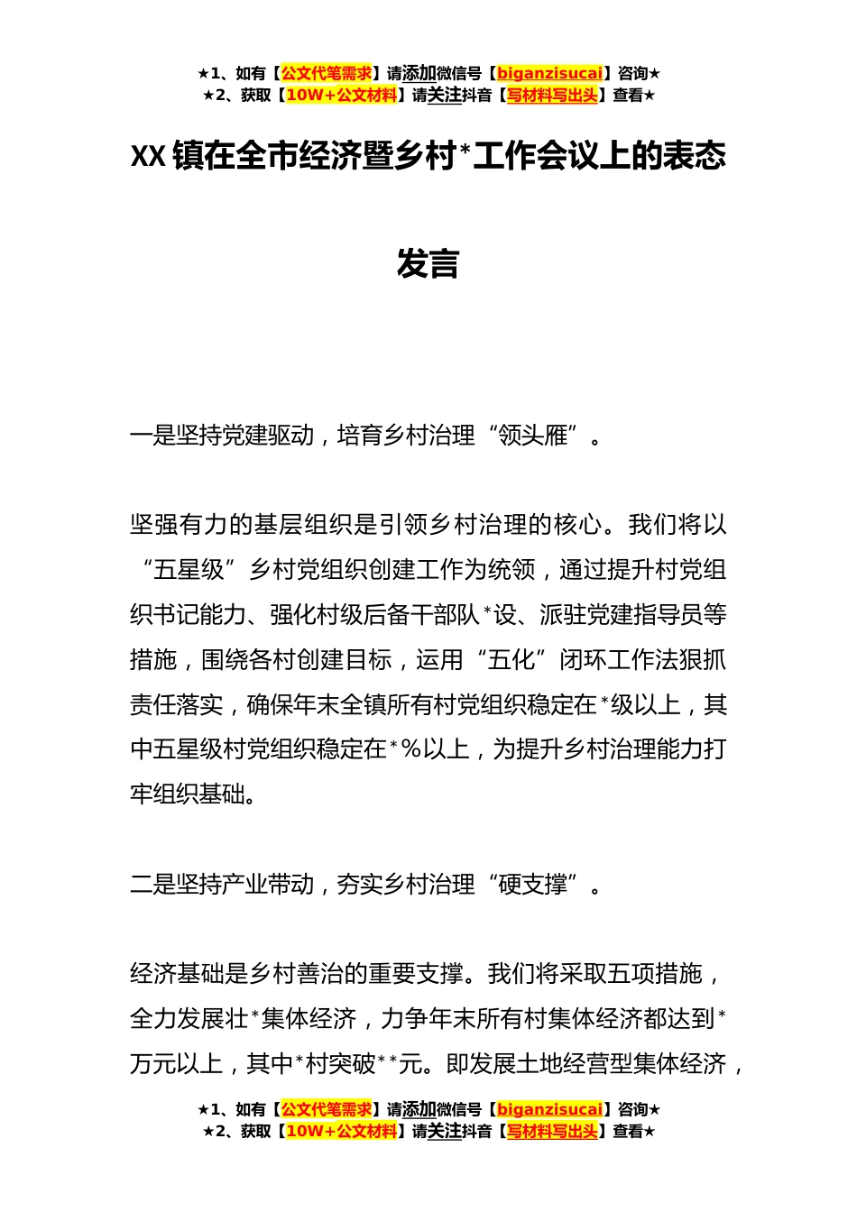 ★1、如有【公文代笔需求】请添加微信号【biganzisucai】咨询★★2、获取【10W+公文材料】请关注抖音【写材料写出头】查看★XX镇在全市经济暨乡村*工作会议上的表态发言一是坚持党建驱动,培育乡村治理“领头雁”。坚强有力的基层组织是引领乡村治理的核心。我们将以“五星级”乡村党组织创建工作为统领,通过提升村党组织书记能力、强化村级后备干部队*设、派驻党建指导员等措施,围绕各村创建目标,运用“五化”闭环工作法狠抓责任落实,确保年末全镇所有村党组织稳定在*级以上,其中五星级村党组织稳定在*%以上,为提升乡村治理能力打牢组织基础。二是坚持产业带动,夯实乡村治理“硬支撑”。经济基础是乡村善治的重要支撑。我们将采取五项措施,全力发展壮*集体经济,力争年末所有村集体经济都达到*万元以上...