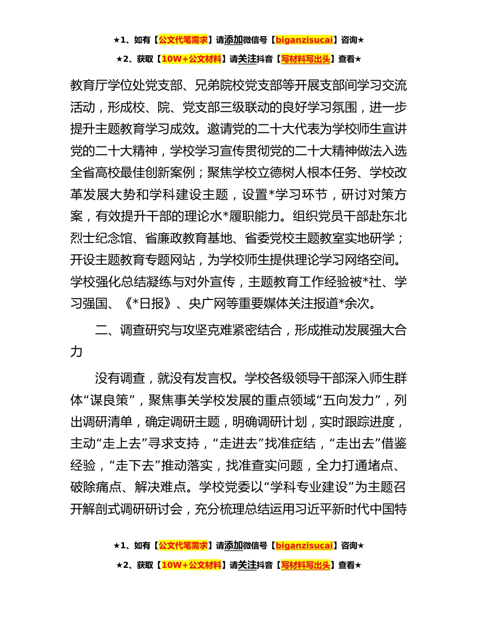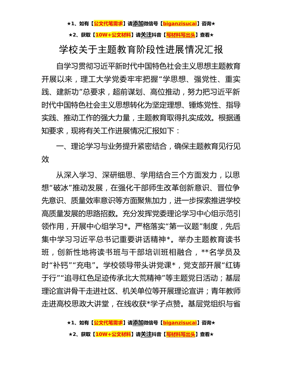 ★1、如有【公文代笔需求】请添加微信号【biganzisucai】咨询★★2、获取【10W+公文材料】请关注抖音【写材料写出头】查看★学校关于主题教育阶段性进展情况汇报自学习贯彻习近平新时代中国特色社会主义思想主题教育“开展以来,理工大学党委牢牢把握学思想、强党性、重实”践、建新功总要求,超前谋划、高位推动,努力把习近平新时代中国特色社会主义思想转化为坚定理想、锤炼党性、指导实践、推动工作的强大力量,主题教育取得扎实成效。根据通知要求,现将有关工作进展情况汇报如下:一、理论学习与业务提升紧密结合,确保主题教育见行见效从深入学习、深研细思、学用结合三个方面发力,以思“”想破冰推动发展,在强化干部师生改革创新意识、晋位争先意识、质量效率意识等方面聚焦加力,进一步探索推进学校高...