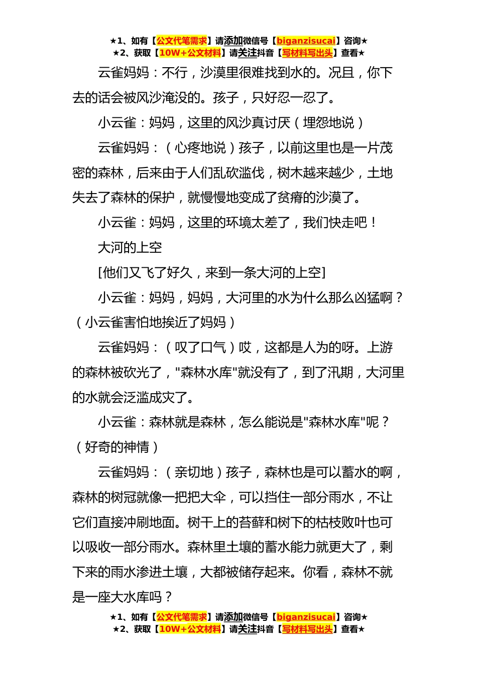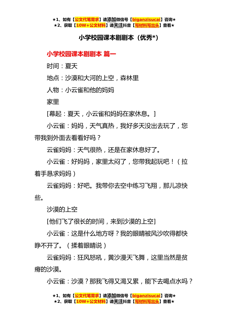 ★1、如有【公文代笔需求】请添加微信号【biganzisucai】咨询★★2、获取【10W+公文材料】请关注抖音【写材料写出头】查看★小学校园课本剧剧本(优秀*)小学校园课本剧剧本篇一时间:夏天地点:沙漠和大河的上空,森林里人物:小云雀和他的妈妈家里[幕起:夏天,小云雀和妈妈在家休息。]小云雀:妈妈,天气真热,我好多天没出去玩了,您带我到外面去看看好吗?云雀妈妈:天气很热,还是在家休息好了。小云雀:好妈妈,家里太闷了,您带我起玩吧!(拉着手恳求妈妈)云雀妈妈:好吧。我带你去空中练习飞翔,那儿凉快些。沙漠的上空[他们飞了很长的时间,来到沙漠的上空]小云雀:这是什么地方呀?我的眼睛被风沙吹得都快睁不开了。(揉着眼睛说)云雀妈妈:狂风怒吼,黄沙漫天飞舞,这里当然是贫瘠的沙漠。小云雀:...