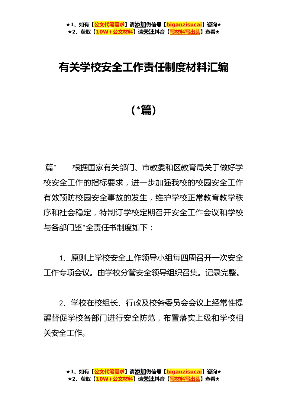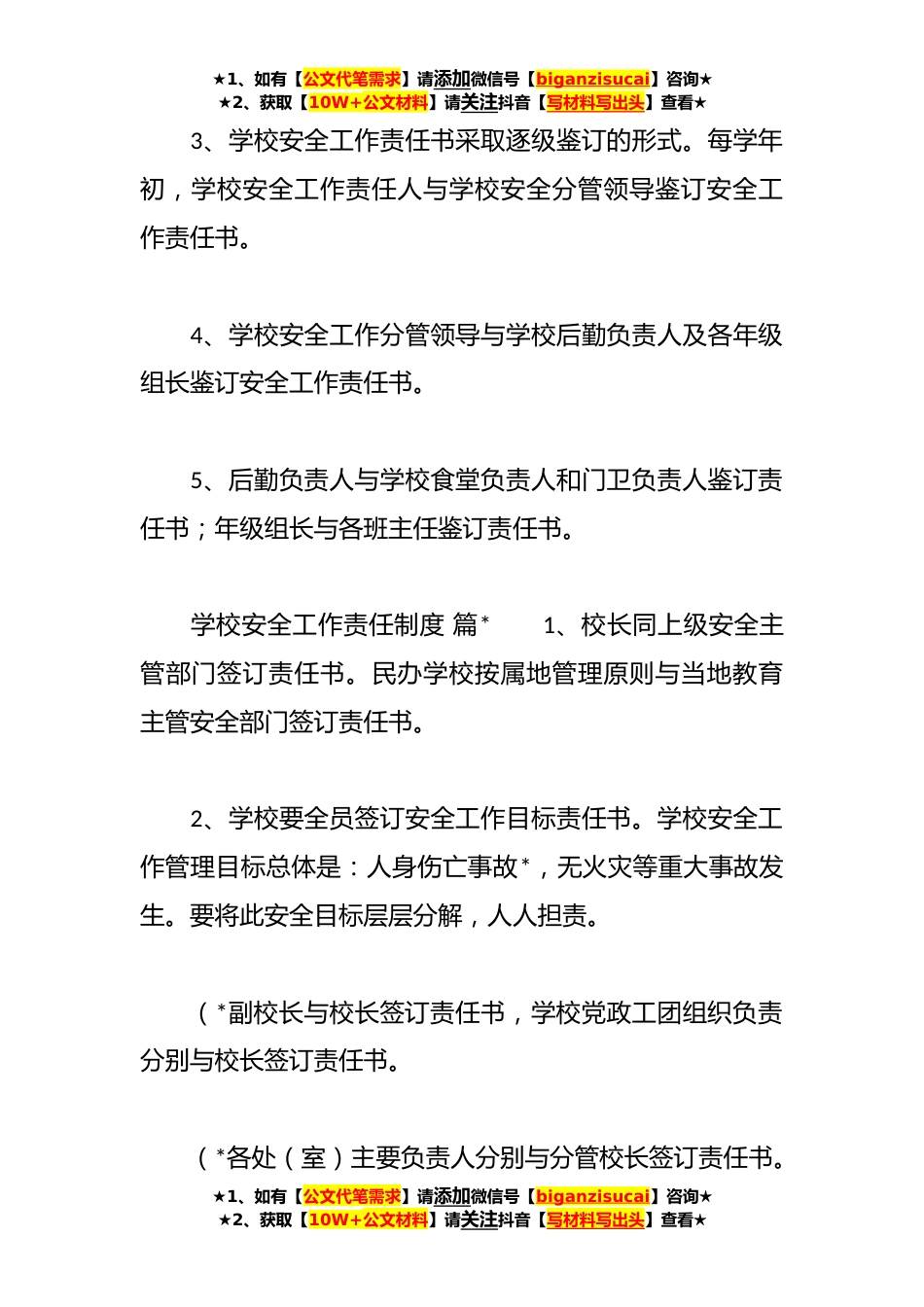 ★1、如有【公文代笔需求】请添加微信号【biganzisucai】咨询★★2、获取【10W+公文材料】请关注抖音【写材料写出头】查看★有关学校安全工作责任制度材料汇编(*篇)篇*根据国家有关部门、市教委和区教育局关于做好学校安全工作的指标要求,进一步加强我校的校园安全工作有效预防校园安全事故的发生,维护学校正常教育教学秩序和社会稳定,特制订学校定期召开安全工作会议和学校与各部门鉴*全责任书制度如下:1、原则上学校安全工作领导小组每四周召开一次安全工作专项会议。由学校分管安全领导组织召集。记录完整。2、学校在校组长、行政及校务委员会会议上经常性提醒督促学校各部门进行安全防范,布置落实上级和学校相关安全工作。★1、如有【公文代笔需求】请添加微信号【biganzisucai】咨询★★2、获取【10W+...