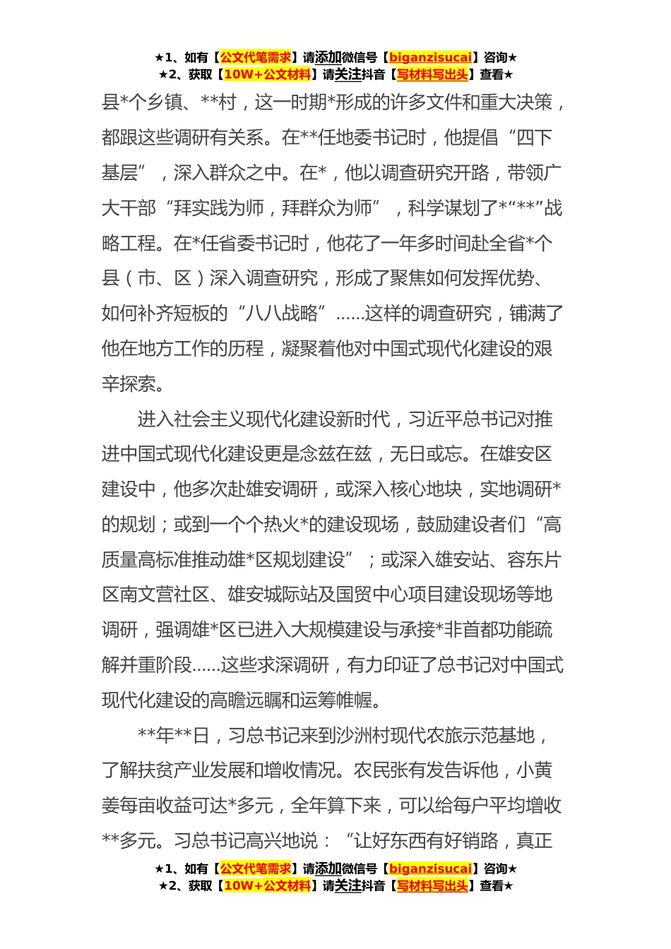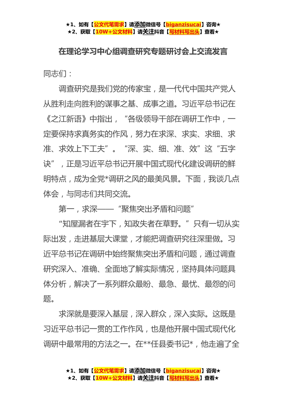 ★1、如有【公文代笔需求】请添加微信号【biganzisucai】咨询★★2、获取【10W+公文材料】请关注抖音【写材料写出头】查看★在理论学习中心组调查研究专题研讨会上交流发言同志们:调查研究是我们党的传家宝,是一代代中国共产党人从胜利走向胜利的谋事之基、成事之道。习近平总书记在《之江新语》中指出,“各级领导干部在调研工作中,一定要保持求真务实的作风,努力在求深、求实、求细、求准、求效上下工夫”。“深、实、细、准、效”这“五字诀”,正是习近平总书记开展中国式现代化建设调研的鲜明特点,成为全党*调研之风的最美风景。下面,我谈几点体会,与同志们共同交流。第一,求深——“聚焦突出矛盾和问题”“知屋漏者在宇下,知政失者在草野。”只有一切从实际出发,走进基层大课堂,才能把调查研究往...