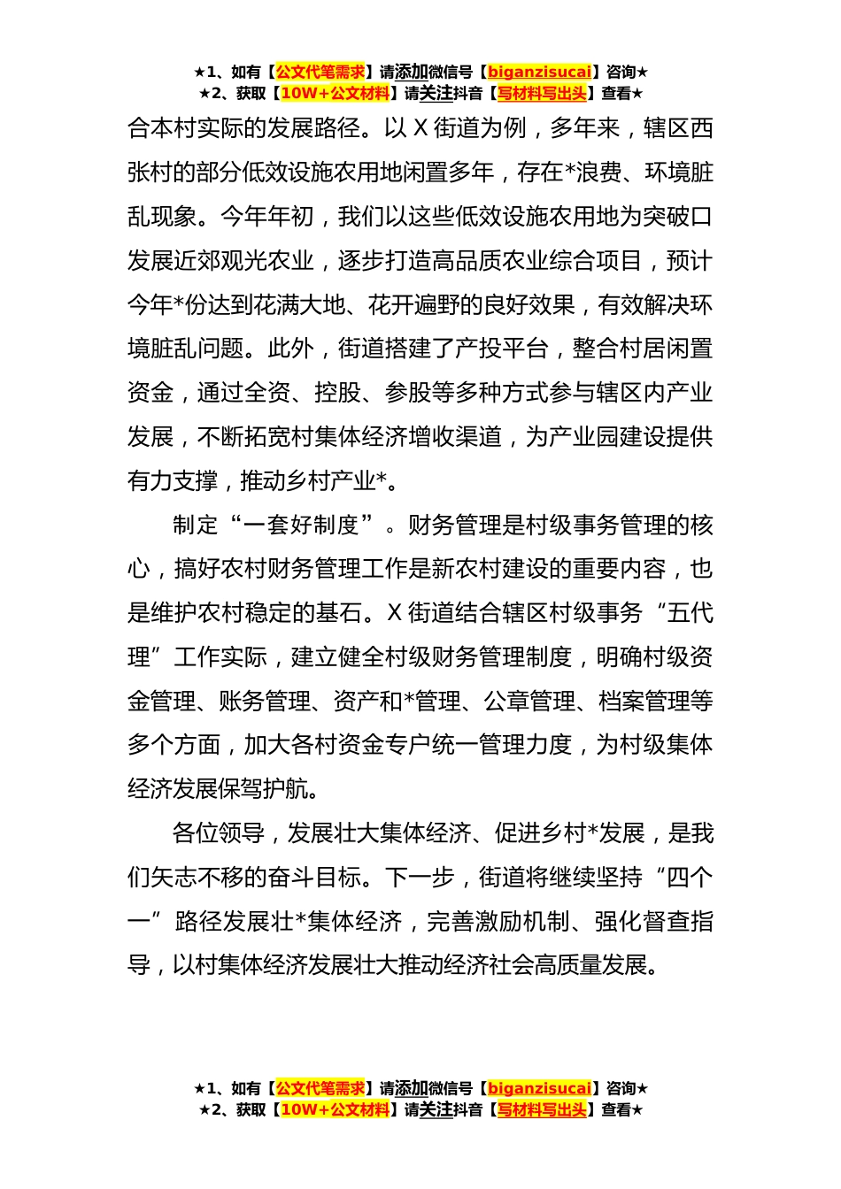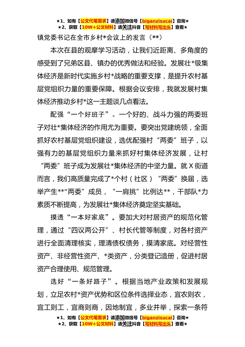 ★1、如有【公文代笔需求】请添加微信号【biganzisucai】咨询★★2、获取【10W+公文材料】请关注抖音【写材料写出头】查看★镇党委书记在全市乡村*会议上的发言(**)本次在县的观摩学习活动,让我们近距离、多角度的感受到了兄弟区县、镇办的优秀做法和经验。发展壮*级集体经济是新时代实施乡村*战略的重要支撑,是提升农村基层党组织力量的重要保障。根据会议安排,我就发展村集体经济推动乡村*这一主题谈几点看法。配强“一个好班子”。一个好的、战斗力强的两委班子对壮*集体经济的作用尤为重要。要突出党建统领,全面抓好农村基层党组织建设,选优配强村“两委”班子,以强有力的基层党组织力量来抓好村集体经济发展,让村“两委”班子成为发展壮*集体经济的中坚力量。就X街道而言,我们高质量完成了*个村(...