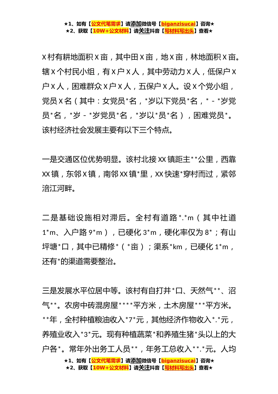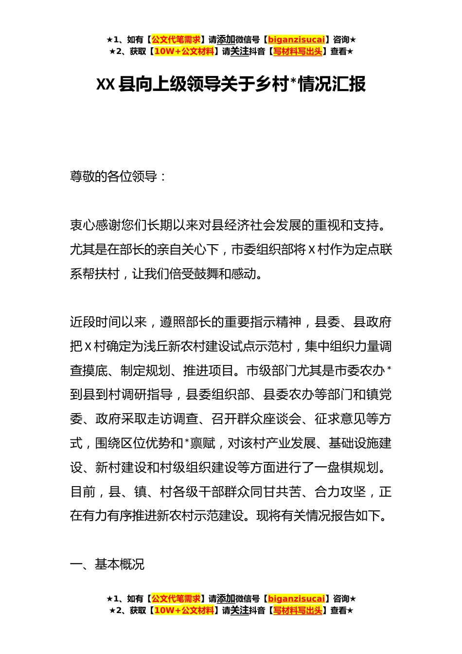 ★1、如有【公文代笔需求】请添加微信号【biganzisucai】咨询★★2、获取【10W+公文材料】请关注抖音【写材料写出头】查看★XX县向上级领导关于乡村*情况汇报尊敬的各位领导:衷心感谢您们长期以来对县经济社会发展的重视和支持。尤其是在部长的亲自关心下,市委组织部将X村作为定点联系帮扶村,让我们倍受鼓舞和感动。近段时间以来,遵照部长的重要指示精神,县委、县政府把X村确定为浅丘新农村建设试点示范村,集中组织力量调查摸底、制定规划、推进项目。市级部门尤其是市委农办*到县到村调研指导,县委组织部、县委农办等部门和镇党委、政府采取走访调查、召开群众座谈会、征求意见等方式,围绕区位优势和*禀赋,对该村产业发展、基础设施建设、新村建设和村级组织建设等方面进行了一盘棋规划。目前,县、镇、...