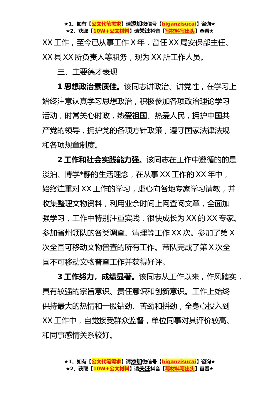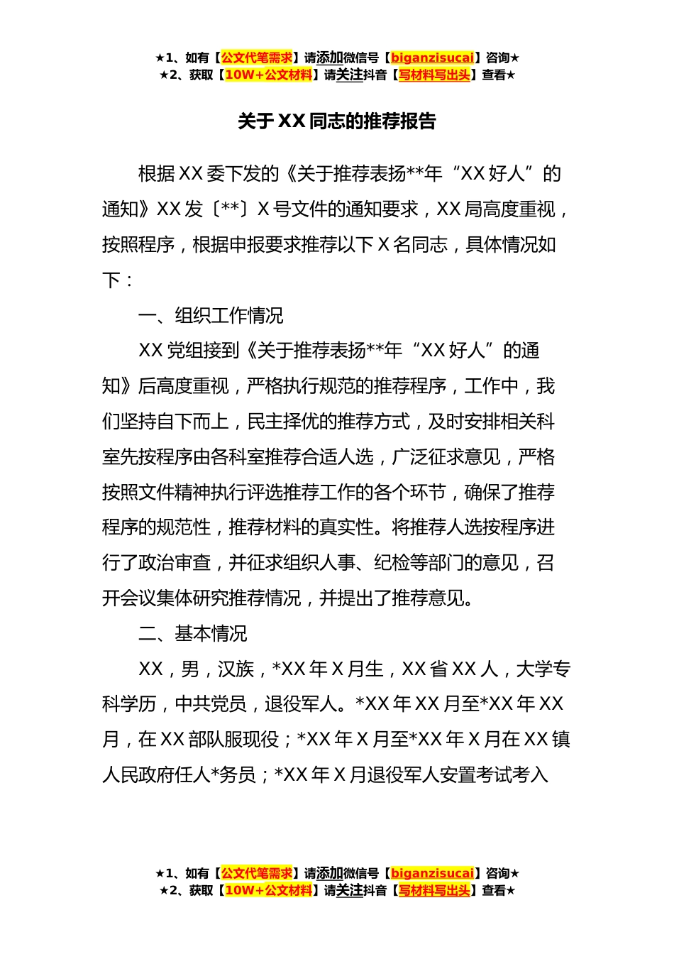 ★1、如有【公文代笔需求】请添加微信号【biganzisucai】咨询★★2、获取【10W+公文材料】请关注抖音【写材料写出头】查看★关于XX同志的推荐报告根据XX委下发的《关于推荐表扬**年“XX好人”的通知》XX发〔**〕X号文件的通知要求,XX局高度重视,按照程序,根据申报要求推荐以下X名同志,具体情况如下:一、组织工作情况XX党组接到《关于推荐表扬**年“XX好人”的通知》后高度重视,严格执行规范的推荐程序,工作中,我们坚持自下而上,民主择优的推荐方式,及时安排相关科室先按程序由各科室推荐合适人选,广泛征求意见,严格按照文件精神执行评选推荐工作的各个环节,确保了推荐程序的规范性,推荐材料的真实性。将推荐人选按程序进行了政治审查,并征求组织人事、纪检等部门的意见,召开会议集体研究推荐情况...