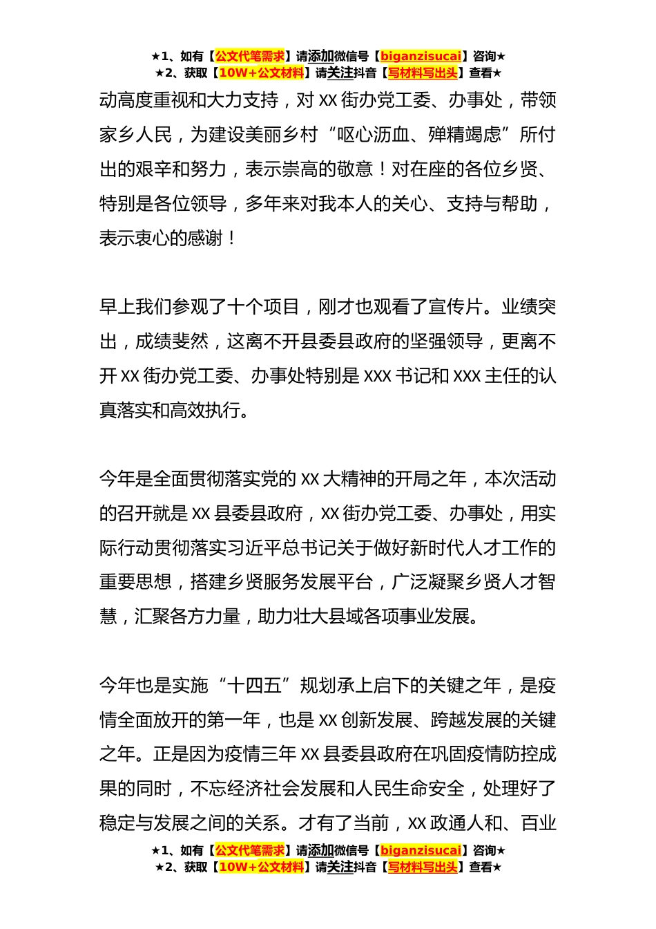 ★1、如有【公文代笔需求】请添加微信号【biganzisucai】咨询★★2、获取【10W+公文材料】请关注抖音【写材料写出头】查看★在第X届“迎乡贤、兴产业、建家园、促*”推介会上的发言尊敬的各位领导、各位乡贤、各位企业家、先生们、女士们:大家下午好今天是个好日子,秋高气爽,高朋满座。此时此刻,XX县XX街办举行“迎乡贤、兴产业、建家园、促*”活动,共叙亲情、友情、事业情、创业情、家乡情、互诉真心、诚心*、爱心,同做协力共创美好未来的个人梦、家乡梦、未来梦。这是一次众人期盼,众望所归的活动;这是一次名流云集、精英荟萃的活动;这是一次乡音盈耳、亲情洋溢的活动。今天,作为XX在外工作的一名代表在此发言,倍感荣幸和自豪。请允许我代表在外的游子向XX县委县政府对本次活★1、如有【公文代笔需求...