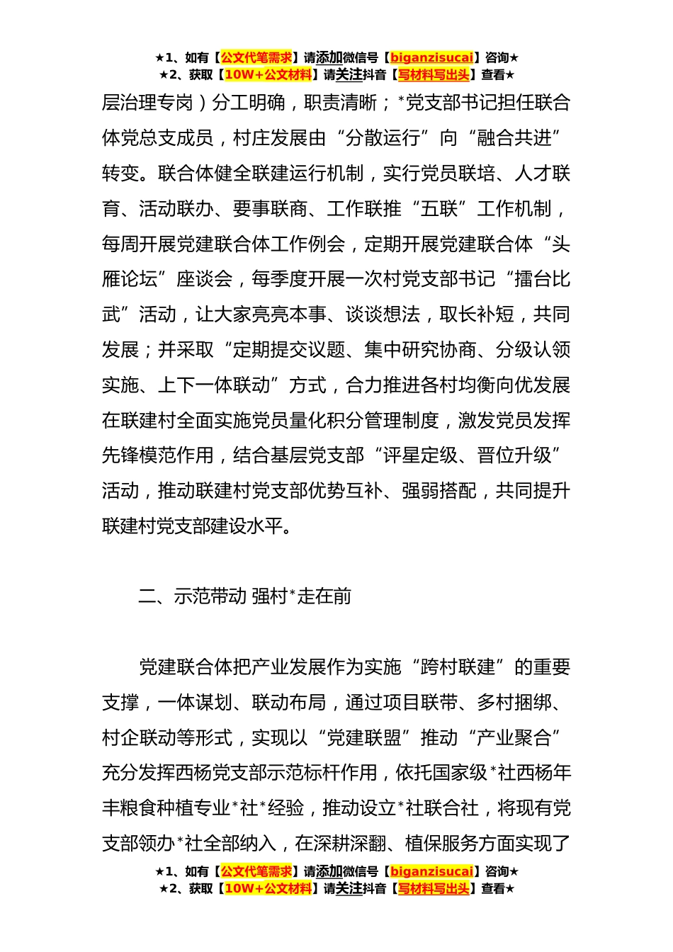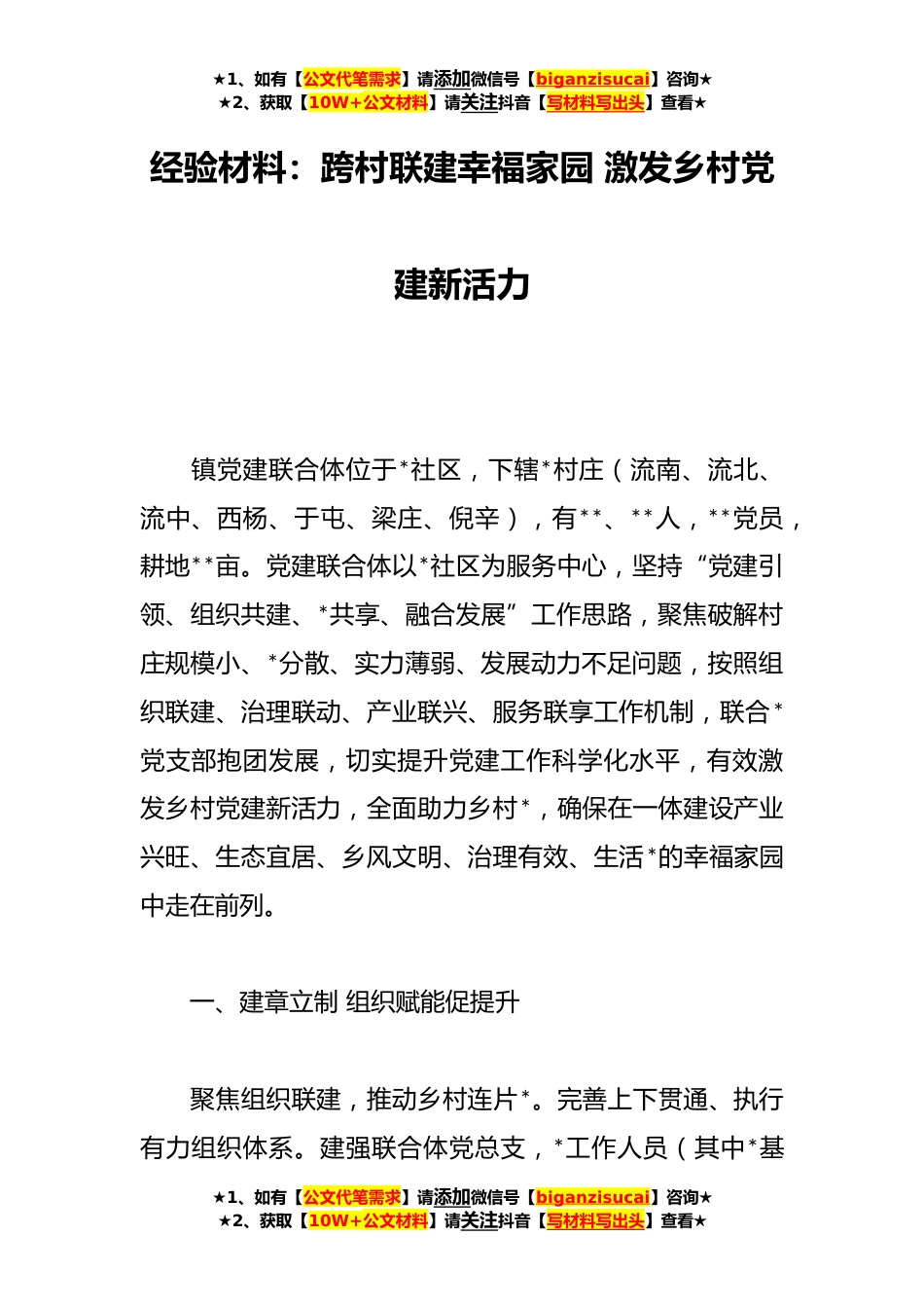 ★1、如有【公文代笔需求】请添加微信号【biganzisucai】咨询★★2、获取【10W+公文材料】请关注抖音【写材料写出头】查看★经验材料:跨村联建幸福家园激发乡村党建新活力镇党建联合体位于*社区,下辖*村庄(流南、流北、流中、西杨、于屯、梁庄、倪辛),有**、**人,**党员,耕地**亩。党建联合体以*社区为服务中心,坚持“党建引领、组织共建、*共享、融合发展”工作思路,聚焦破解村庄规模小、*分散、实力薄弱、发展动力不足问题,按照组织联建、治理联动、产业联兴、服务联享工作机制,联合*党支部抱团发展,切实提升党建工作科学化水平,有效激发乡村党建新活力,全面助力乡村*,确保在一体建设产业兴旺、生态宜居、乡风文明、治理有效、生活*的幸福家园中走在前列。一、建章立制组织赋能促提升聚焦组织联...