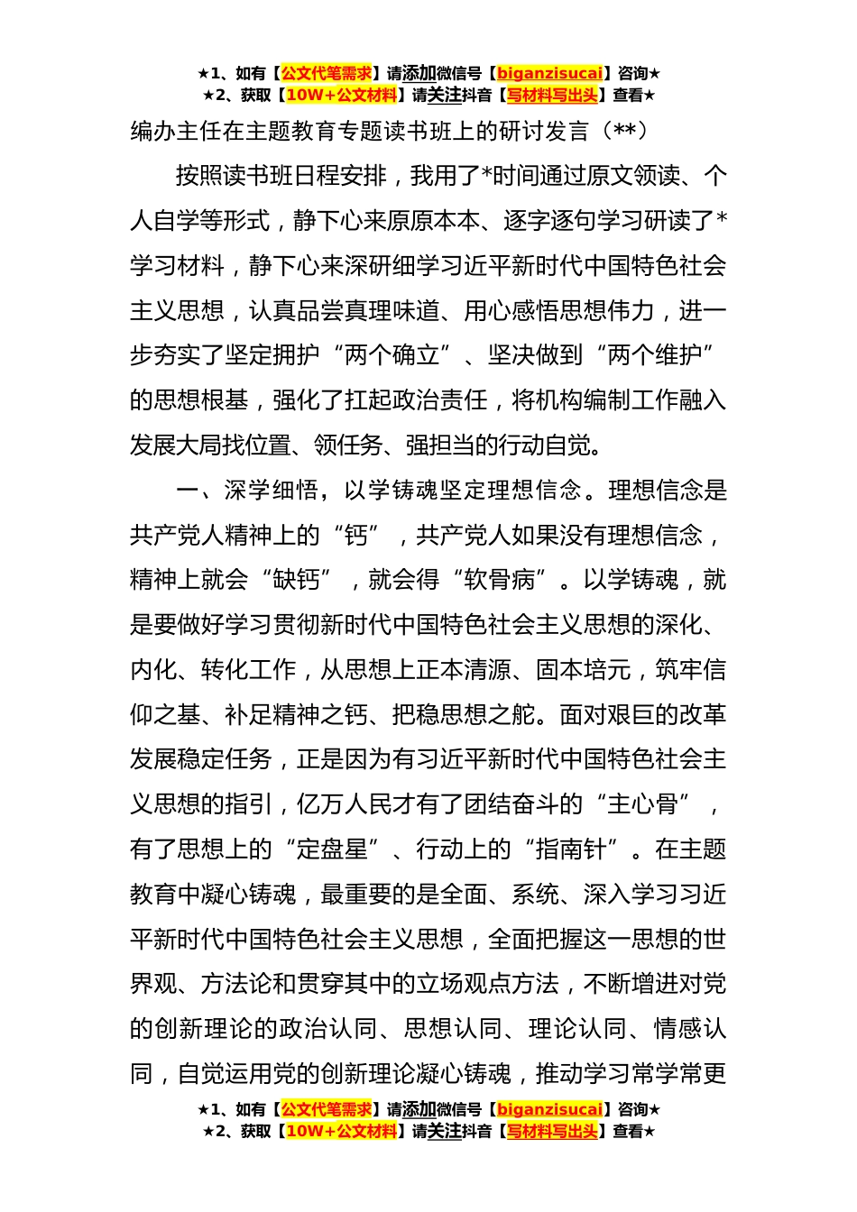 ★1、如有【公文代笔需求】请添加微信号【biganzisucai】咨询★★2、获取【10W+公文材料】请关注抖音【写材料写出头】查看★编办主任在主题教育专题读书班上的研讨发言(**)按照读书班日程安排,我用了*时间通过原文领读、个人自学等形式,静下心来原原本本、逐字逐句学习研读了*学习材料,静下心来深研细学习近平新时代中国特色社会主义思想,认真品尝真理味道、用心感悟思想伟力,进一步夯实了坚定拥护“两个确立”、坚决做到“两个维护”的思想根基,强化了扛起政治责任,将机构编制工作融入发展大局找位置、领任务、强担当的行动自觉。一、深学细悟,以学铸魂坚定理想信念。理想信念是共产党人精神上的“钙”,共产党人如果没有理想信念,精神上就会“缺钙”,就会得“软骨病”。以学铸魂,就是要做好学习贯...