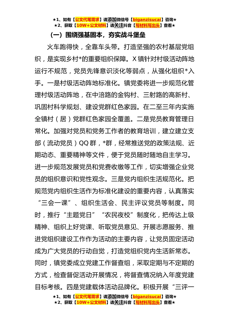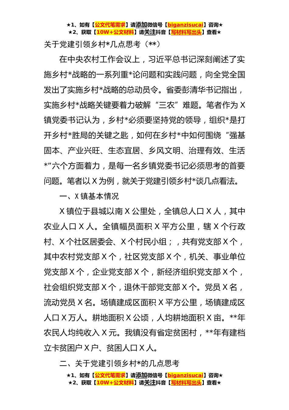 ★1、如有【公文代笔需求】请添加微信号【biganzisucai】咨询★★2、获取【10W+公文材料】请关注抖音【写材料写出头】查看★关于党建引领乡村*几点思考(**)在中央农村工作会议上,习近平总书记深刻阐述了实施乡村*战略的一系列重*论问题和实践问题,向全党全国发出了实施乡村*战略的总动员令。省委彭清华书记指出,实施乡村*战略关键要着力破解“三农”难题。笔者作为X镇党委书记认为,乡村*必须要坚持党的领导,组织*是打开乡村*胜局的关键之匙,如何在乡村*中如何围绕“强基固本、产业兴旺、生态宜居、乡风文明、治理有效、生活*”六个方面着力,是每一名乡镇党委书记必须思考的首要问题。笔者以X为例,就关于党建引领乡村*谈几点看法。一、X镇基本情况X镇位于县城以南X公里处,全镇总人口X人,其中农业人口X...