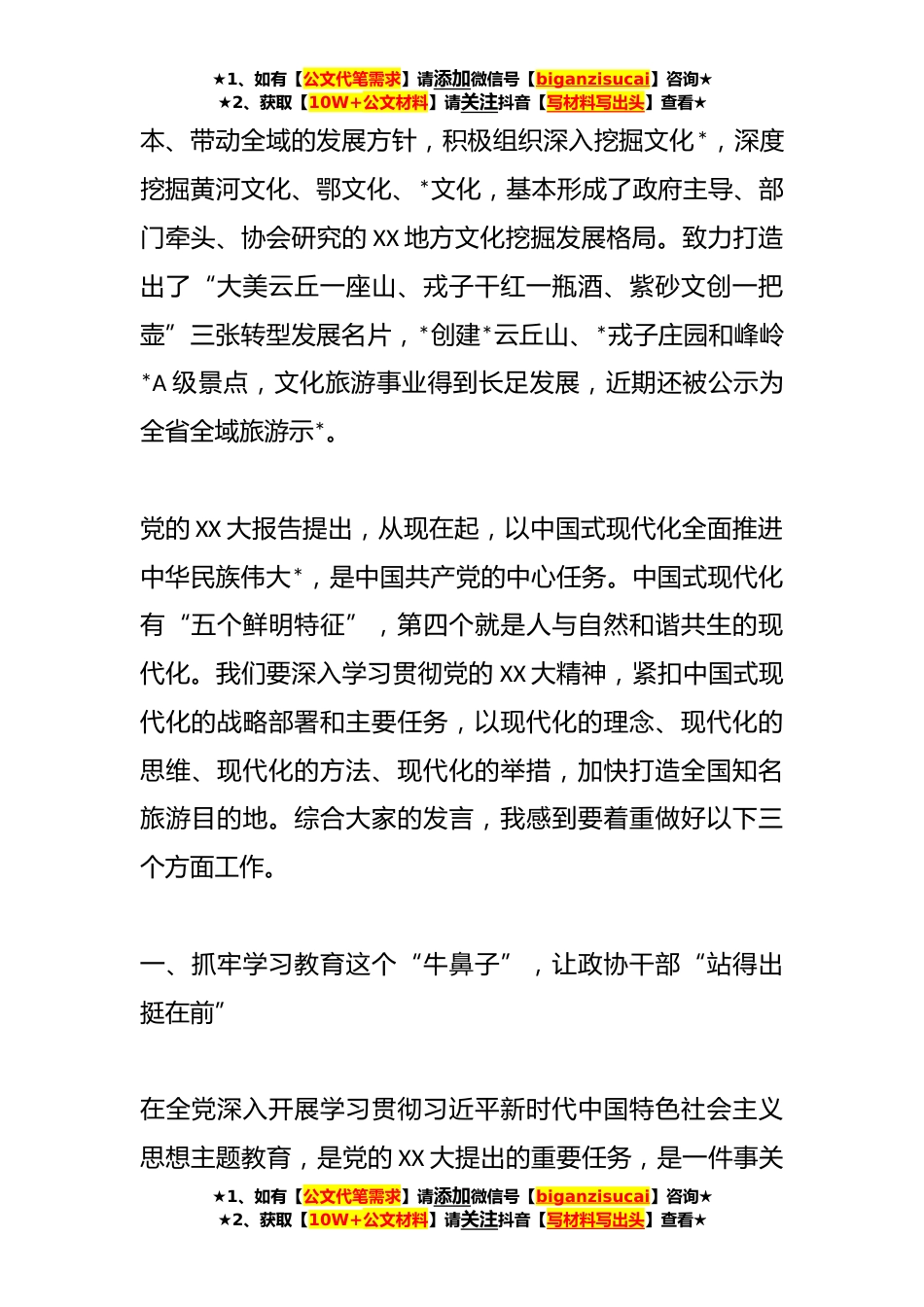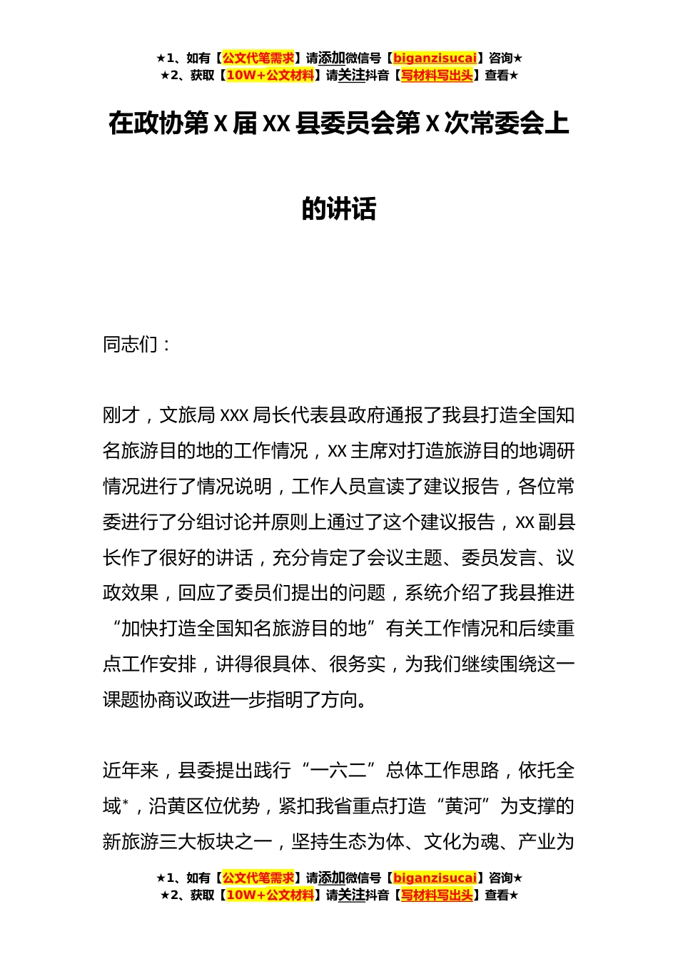 ★1、如有【公文代笔需求】请添加微信号【biganzisucai】咨询★★2、获取【10W+公文材料】请关注抖音【写材料写出头】查看★在政协第X届XX县委员会第X次常委会上的讲话同志们:刚才,文旅局XXX局长代表县政府通报了我县打造全国知名旅游目的地的工作情况,XX主席对打造旅游目的地调研情况进行了情况说明,工作人员宣读了建议报告,各位常委进行了分组讨论并原则上通过了这个建议报告,XX副县长作了很好的讲话,充分肯定了会议主题、委员发言、议政效果,回应了委员们提出的问题,系统介绍了我县推进“加快打造全国知名旅游目的地”有关工作情况和后续重点工作安排,讲得很具体、很务实,为我们继续围绕这一课题协商议政进一步指明了方向。近年来,县委提出践行“一六二”总体工作思路,依托全域*,沿黄区位优势,...